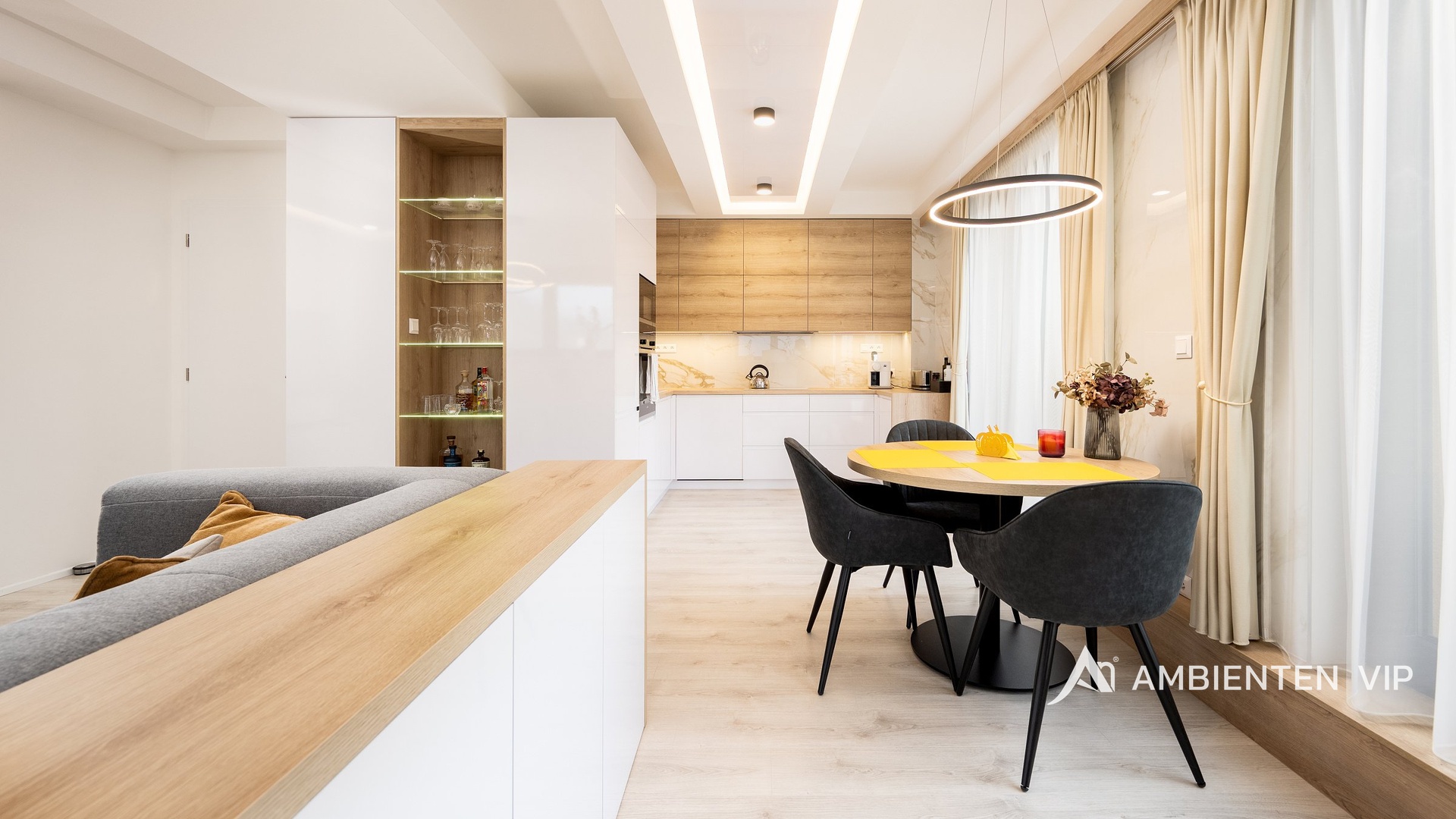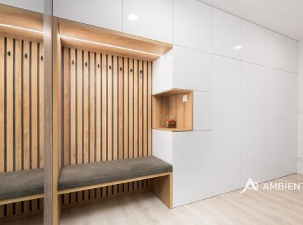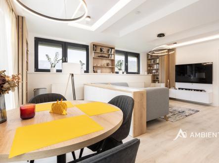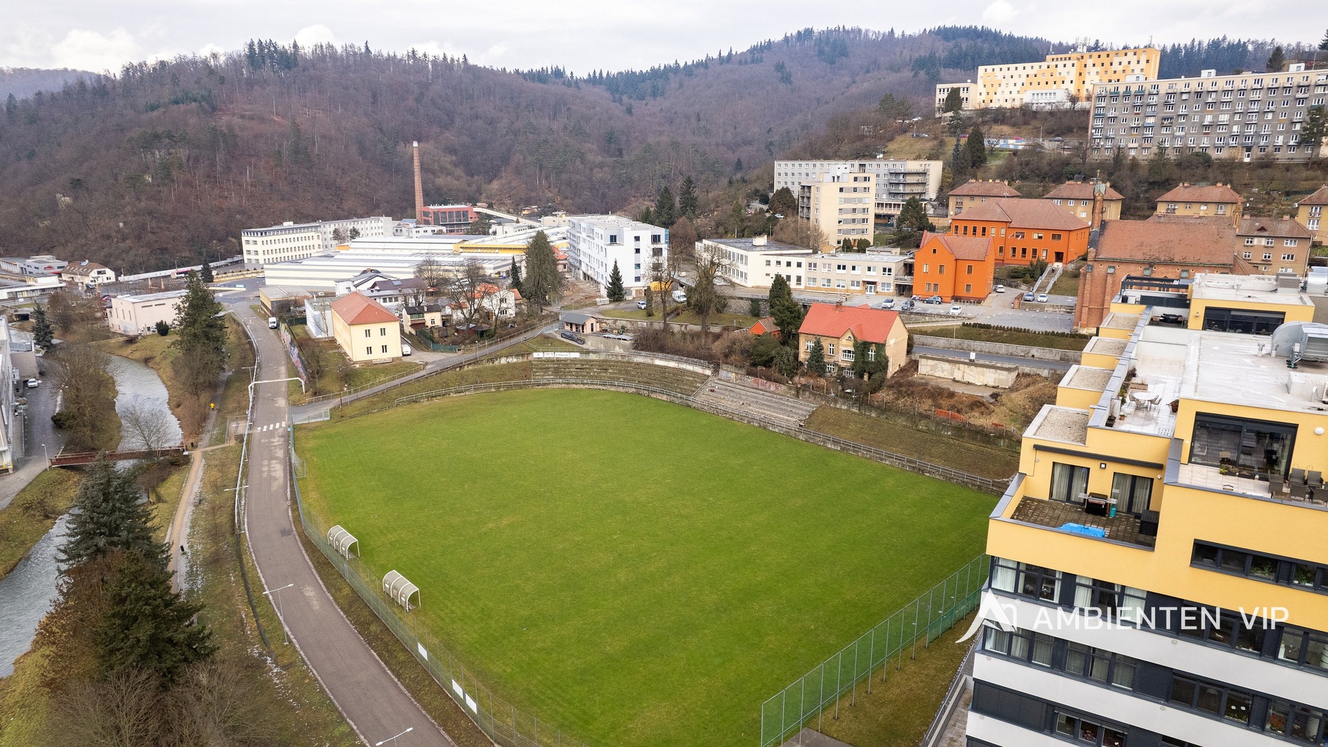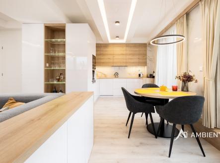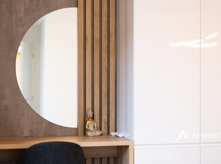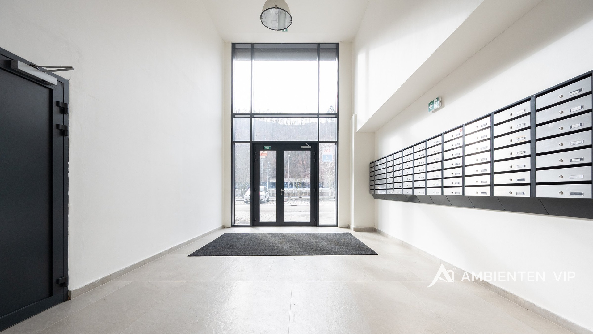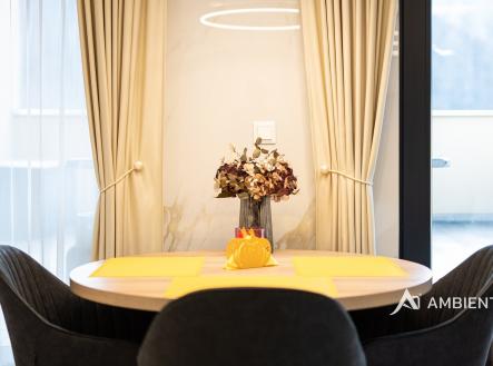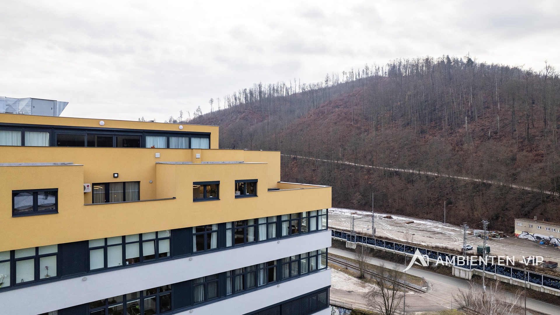 AMBIENTEN VIP vám nabízí exkluzivně ke koupi výjimečný byt o dispozici 2+kk podlahové ploše 74 m², umístěný v 9. nadzemním podlaží moderního bytového domu Terasy Adamov z roku 2021. Realizace interiérů bytu proběhla v roce 2024. K bytu náleží dvě prostorné terasy – západně orientovaná terasa o velikosti 13,58 m² a hlavní jihozápadní terasa o rozloze 42,23 m², vybavená markýzou, přívodem elektřiny a vody, ideální pro posezení s rodinou či přáteli s výhledem do okolních lesů. K bytu náleží parkovací stání přímo před domem. Interiér byl luxusně navržen studiem GALA Design s maximálním důrazem na komfort, funkčnost a nadčasovou estetiku. Dominantou bytu je obytný prostor o velikosti 35 m² s plně vybaveným kuchyňským koutem a spotřebiči Electrolux vyšší řady. Samozřejmostí je ambientní osvětlení, které v kombinaci s jihozápadní orientací zajišťuje dostatek přirozeného světla po celý den. Na západně orientovaných oknech jsou instalovány předokenní žaluzie. V bytě se nachází dvě klimatizační jednotky. Ložnice nabízí nejen klid a soukromí, ale také dostatek úložných prostor v podobě designových vestavěných skříní. Dámy jistě ocení stylový toaletní stolek se zrcadlem, který je elegantní i praktickou součástí interiéru. Další úložné prostory jsou chytře řešeny také v předsíni a koupelně, takže byt působí vzdušně a organizovaně. Velkou přidanou hodnotou je výška podlaží, která spolu s orientací bytu zajišťuje nejen dostatek světla, ale také pocit soukromí a klidu, který v nižších patrech často chybí. Výhledy do zeleně a lesů umocňují atmosféru bydlení. Majitel si nemovitost navrhoval pro vlastní potřeby, a proto se zde nešetřilo na kvalitě ani detailech. Byt se prodává kompletně zařízený, bez nutnosti dalších investic. Stačí se nastěhovat s osobními věcmi. Součástí nabídky jsou dva sklepy – jeden přímo na patře před bytem, druhý v 1. NP budovy a parkování. Bytový dům je vytápěn tepelnými čerpadly a splňuje energetickou třídu B – velmi úsporná, což zajišťuje nízké provozní náklady. Terasy Adamov jsou koncipovány s důrazem na komfort každodenního života a v bezprostředním okolí naleznete služby, obchody a občanskou vybavenost, které eliminují nutnost každodenního dojíždění. Přesto zůstává bydlení klidné, s přímým napojením na přírodu a rekreační zóny. Lokalita je ideální volbou pro ty, kteří chtějí bydlet v zeleni, ale neztratit kontakt s Brnem (cca 20 minut autem i MHD). Adamov je zároveň branou do Moravského krasu a nabízí kompletní infrastrukturu, školy, zdravotní péči i bohaté sportovní a kulturní vyžití. Byt je ideální volbou pro náročného klienta, který hledá kombinaci soukromí, komfortu a nadčasového designu. Kombinace moderní architektury, kvalitního provedení, energetické úspornosti a atraktivní lokality z něj činí mimořádně zajímavou příležitost. Bližší informace vám velice rád sdělím po telefonu nebo na osobní prohlídce. V případě zájmu o prohlídku mě neváhejte kontaktovat. Provize RK je hrazena nad rámec kupní ceny stranou kupující.