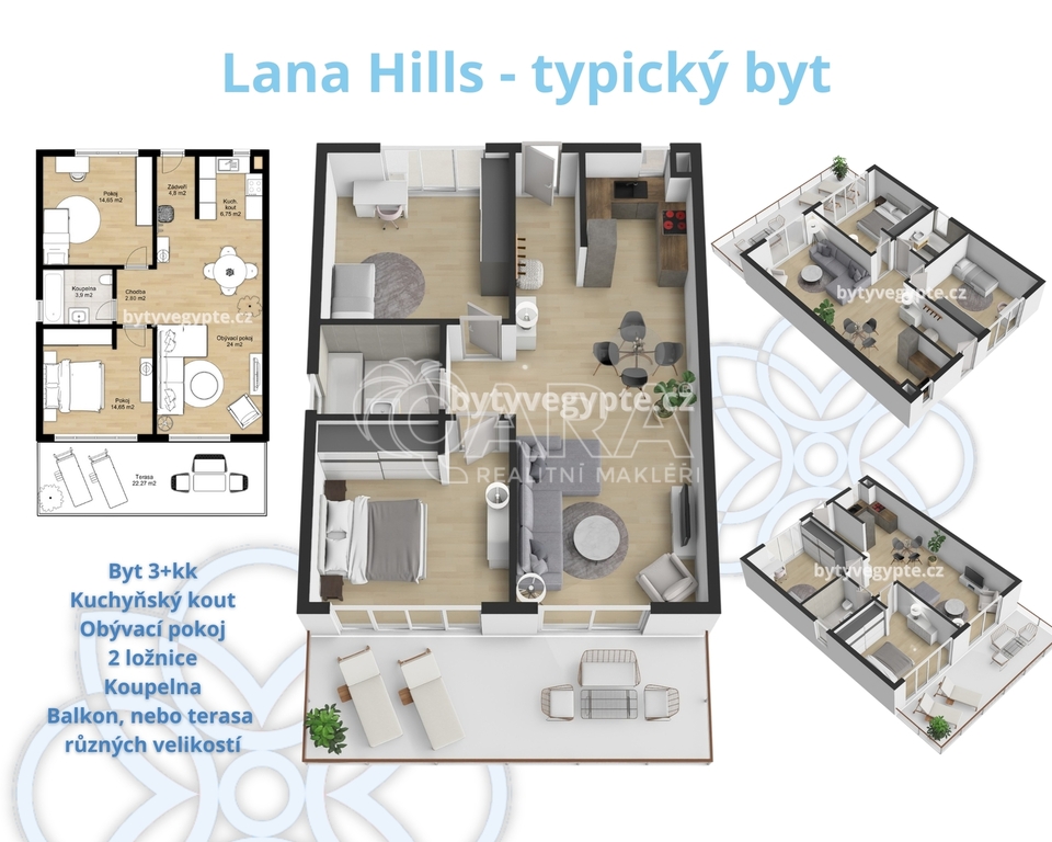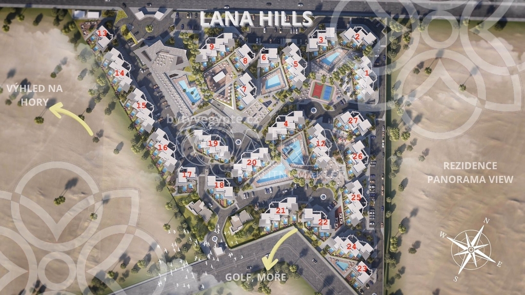 Lana Hills je moderní rezidenční projekt v resortním stylu, který spojuje výhodu pobřežní lokality, atraktivních výhledů a vysokého komfortu. Nachází se v jižní části prestižního letoviska Sahl Hasheesh, přibližně 5–10 minut chůze od moře a centra s restauracemi, kavárnami a obchody. Klidná oblast s rozvinutou infrastrukturou, kvalitními plážemi a nízkou zástavbou vytváří ideální prostředí pro rekreaci i celoroční bydlení. V okolí se nachází promenáda, golfové hřiště, přístaviště i zázemí pro volný čas a sport. Projekt tvoří komorní rezidenční komplex s menším počtem jednotek v jednotlivých domech. Zástavba je rozmístěna do menších celků propojených zahradami a pěšími cestami, což zaručuje soukromí a klid. Součástí areálu je klubový dům s restaurací, fitness centrum, paddle a tenisové kurty, bazény, dětské hřiště s menším aqua parkem, odpočinkové zóny a doprava golfovými vozíky. Nabízený byt 3+kk nabízí komfortní dispozici: dvě samostatné ložnice, obývací pokoj s kuchyňským koutem, balkon a koupelnu. Většina bytů v projektu poskytuje výhled na zeleň, moře nebo okolní hory. Bytové jednotky se prodávají bez vybavení. Na podlahách bude položena keramická dlažba, kuchyňský kout i koupelna budou obloženy obklady, koupelna bude plně osazena (WC, umyvadlo, sprchový kout). Součástí standardu jsou zásuvky, vypínače, dveře a hliníková okna. Cena 95157 EUR uvedená v inzerátu odpovídá zvýhodněné částce při okamžité úhradě celé kupní ceny se slevou. Kupní cenu bez slevy (105730 EUR) je možné uhradit ve splátkách po dobu tří let, s minimální 25% zálohou při podpisu kupní smlouvy. Byt bude předán do užívání v prosinci 2026. V resortu jsou k dispozici i další byty v jiných budovách. Dispozice samotného vnitřního prostoru jsou podobné, byty se liší podle podlaží ve tvaru a velikosti balkonů. V nejvyšším patře mají majitelé bytů možnost používání střešní terasy. Byty v přízemí mají malou soukromou zahrádku s možností vybudování menšího soukromého bazénu. Našim klientům nabízíme kompletní asistenci při zařizování a vybavení bytu prostřednictvím ověřeného dodavatele. Před dokončením bude provedeno zaměření a vypracován prostorový a estetický návrh interiéru. Následně lze zajistit nákup a výrobu nábytku na míru, instalaci klimatizace a další detaily podle přání budoucího majitele. Lana Hills spojuje moderní architekturu, soukromí a příjemné prostředí – ideální volba pro ty, kteří hledají klidné bydlení u moře s možností výhodného financování a zhodnocení investice.