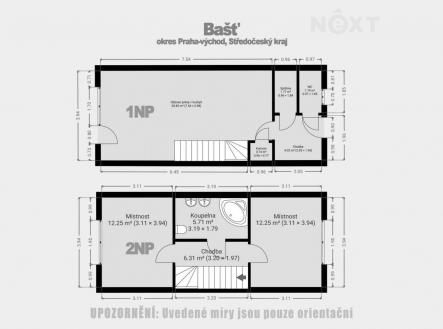 Dovolujeme si Vám nabídnout k prodeji řadový dům 74 m² v obci Bašť na pozemku o velikosti 117m². Dům byl zkolaudován v roce 2006 a v roce 2015 proběhla dílčí rekonstrukce - nová kuchyně a podlahy v domě. Jedná se o moderní rodinný dům s krásnou zahrádkou 37 m² pro relax po práci dispozice: 3kk s podlahovou plochou 74 m² 1NP - vstupní chodba, komora, samostatné WC, obývací pokoj s kuchyňským koutem a vstupem na zahradu 2NP - dva pokoje, koupelna s vanou a WC 3NP - půdní prostory U domu stání pro auto Dům je stavěn z cihelných bloků bez zateplení, okna plastová - 2 skla, střecha budovy betonová taška. Podlahy v pokojích plovoucí, na chodbách, v koupelně a WC je dlažba. Vytápění řešeno plynovým kondenzačním kotlem v kombinaci s radiátory, teplá voda skrze kotel. Elektřina 230/380 v mědi, plyn v domě využíván pouze na topení. Dům je napojen na obecní vodovod a kanalizaci. Náklady na bydlení voda 500/měsíc, elektřina 1000/měsíc, plyn 1500/měsíc Velmi dobrá dostupnost do Prahy 15min autem, 20min busem číslo 368 na metro Ládví. Možno financovat hotově i hypotékou - zařídíme. Zveme Vás na prohlídku. Pro komunikaci uvádějte evidenční číslo zakázky N113415.