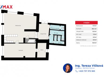 Sníte o vlastní restauraci nebo poctivé české hospůdce, kam si místní i lidé ze širokého okolí přijdou rádi na dobré jídlo? Právě pro takový projekt je tento prostor v Tyršově ulici v Bělé pod Bezdězem jako stvořený. Prostor se nachází přímo u kruhového objezdu v centru města – místo s výjimečnou viditelností a stálým pohybem lidí. Díky poloze přímo u kruhového objezdu se o vás dozví i lidé, kteří nejsou místní. Bělá pod Bezdězem je město s přibližně pěti tisíci obyvateli. Ačkoliv nabízí kompletní občanskou vybavenost – školy, školky, obchody, zdravotní i další služby – kvalitní místa, kam si zajít na dobré jídlo, uspořádat rodinnou oslavu nebo se příjemně sejít s přáteli, zde dlouhodobě chybí. I proto má tento prostor do budoucna velký potenciál. Celková podlahová plocha určená pro nájemce činí dle našeho zaměření 167 m², a to včetně sociálního zázemí a dvou sklepních prostor, které k restauraci přímo náleží. Restaurace s barem má 71 m². Zázemí kuchyně a sklad mají 45,5 m². Dispoziční uspořádání si můžete prohlédnout na plánku ve fotogalerii. Prostor navazuje na dlouhou historii místa, kde dříve fungovala známá hospoda U Beránků. Jedná se o cihlovou stavbu, která v posledních měsících prošla kompletní rekonstrukcí: nová okna a vstupní dveře, nová dlažba, nové rozvody elektřiny i vody. Prostor je vytápěn vlastním elektrickým kotlem. Kuchyně a sociální zázemí mají každý vlastní elektrický bojler. Elektřina i voda mají vlastní měření. V kuchyni je zavedena vzduchotechnika a instalovány nerezové dřezy. Ostatní zařízení a gastro vybavení je na nájemci, který si prostor upraví a dokončí podle vlastního provozního konceptu. Pro inspiraci jsme do fotogalerie umístili pár návrhů interiéru restaurace s vybavením. Platební podmínky: Nájemné: 20 000 Kč / měsíc (případně dle dohody) Kauce: 40 000 Kč Záloha na vodu: 2 000 Kč / měsíc Elektřina: převádí se na nájemce Provize realitní kanceláře: 24 200 Kč Prostor je k dispozici ihned. Zajímavá příležitost právě pro vás, pokud chcete dát tomuto místu nový příběh. Těším se na vás na prohlídce. Zavolejte mi — ráda se s vámi v prostoru potkám. Ing. Tereza Vlčková | realitní makléřka