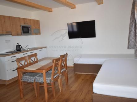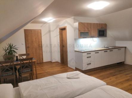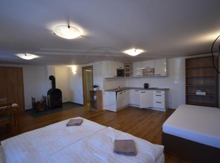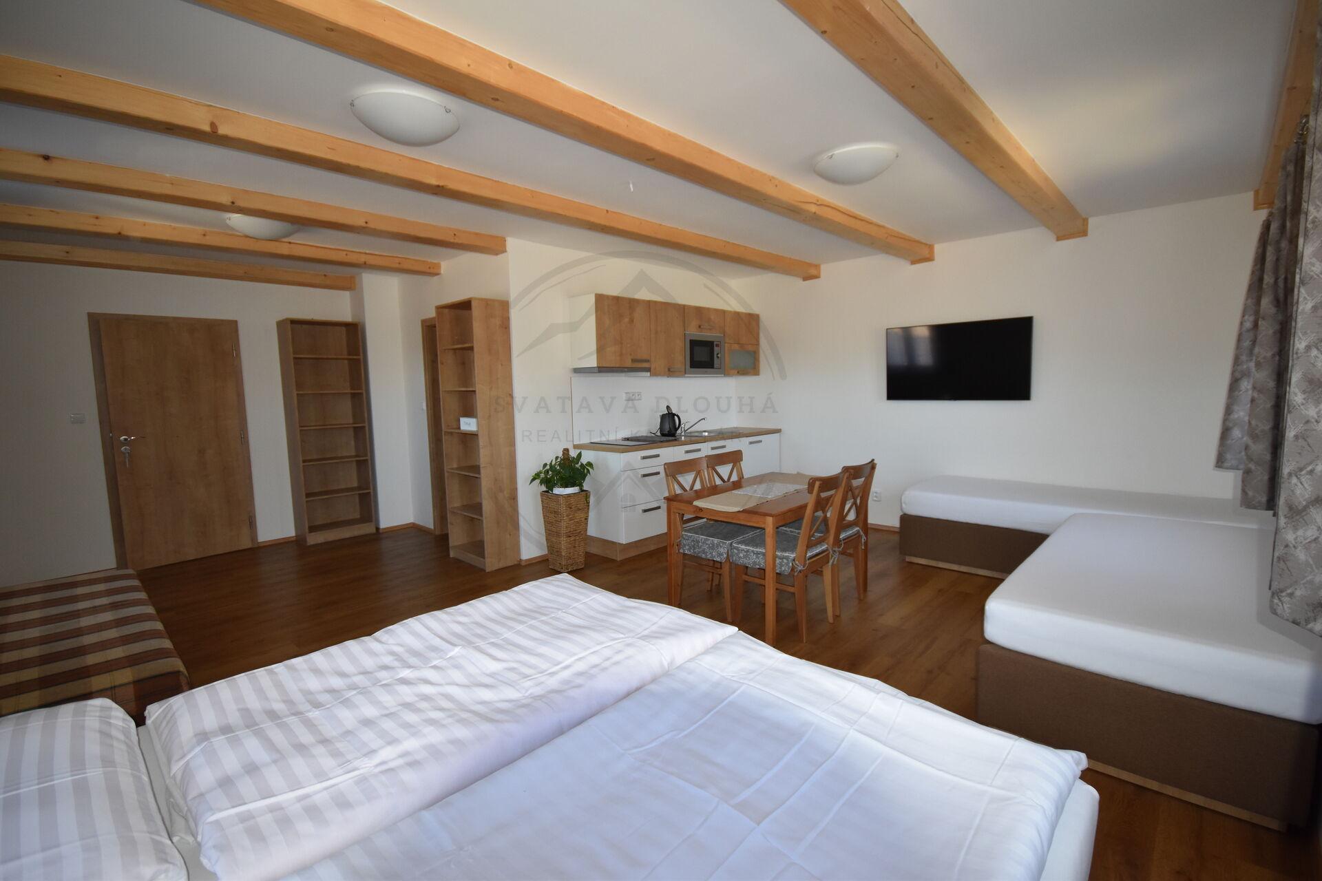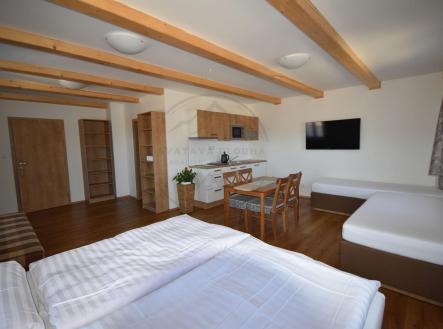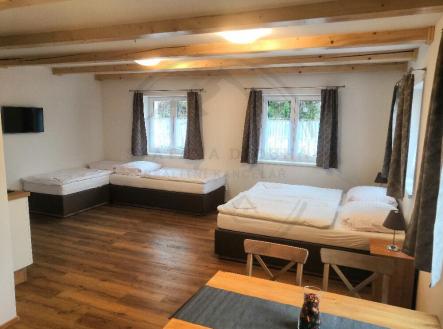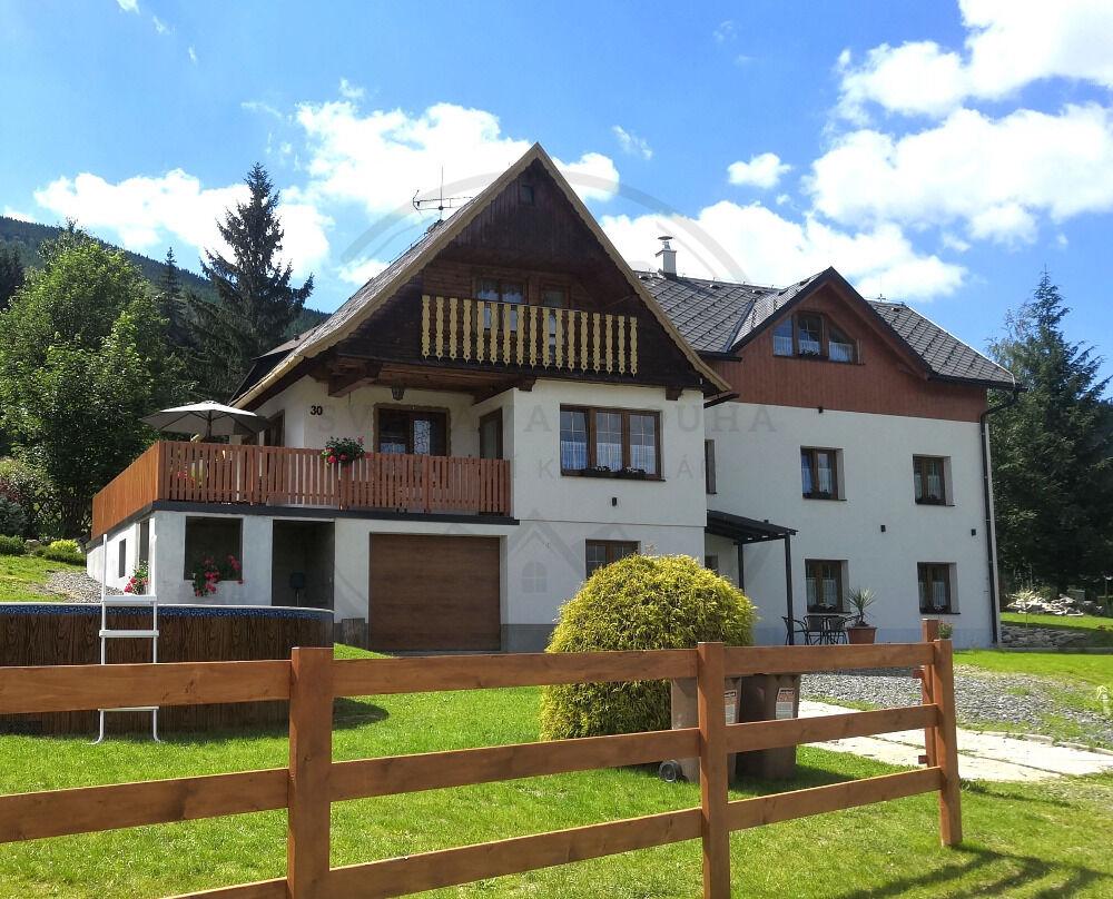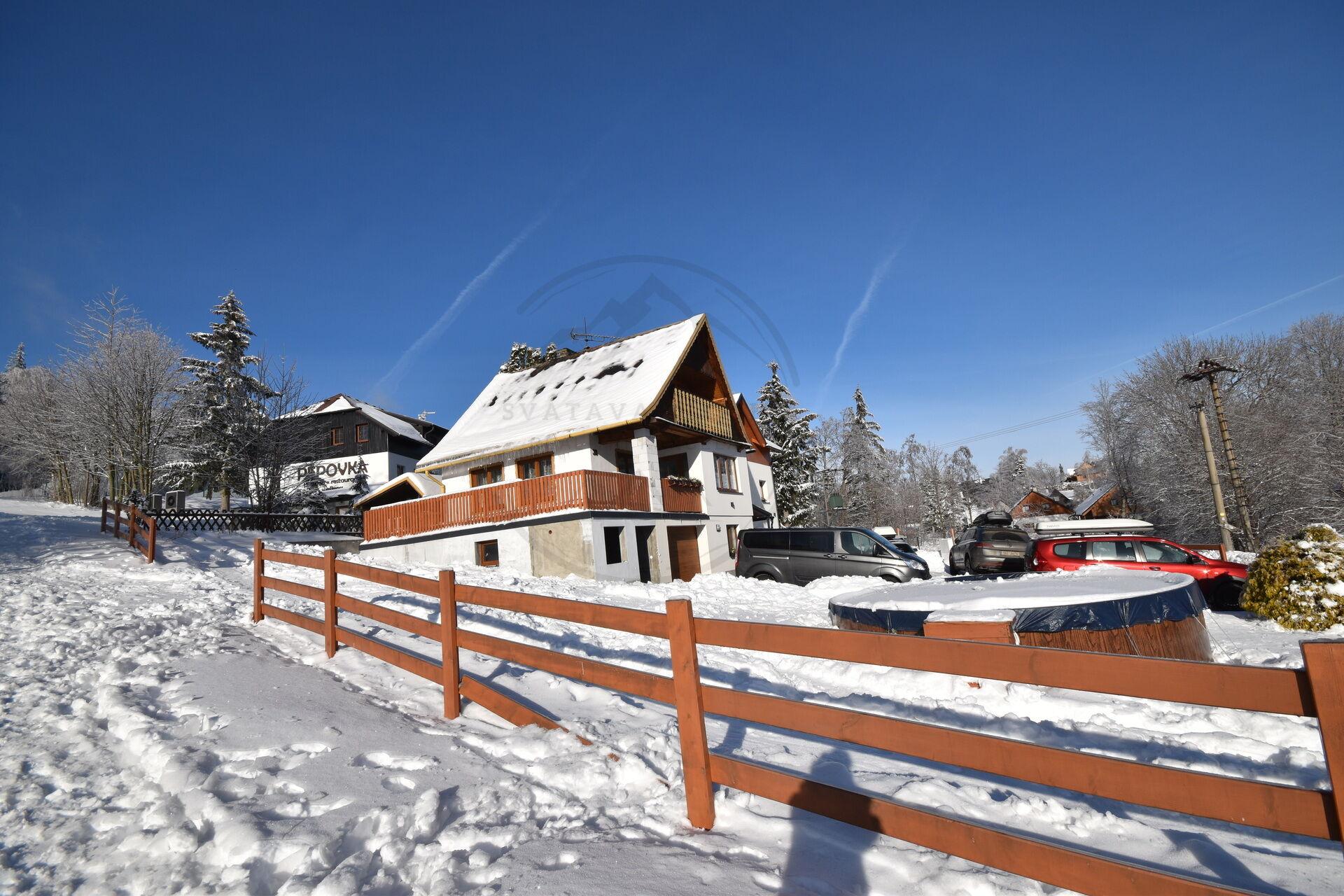 Ve výhradním zastoupení Vám tímto nabízíme ke koupi stylově vybavený dům, v atraktivní horské lokalitě Jeseníků, v obci Filipovice, v těsné blízkosti známého lyžařského areálu se sedačkovou lanovkou. Vzhledem k omezené nabídce nemovitostí v této vyhledávané lokalitě se jedná o mimořádnou příležitost. Původní část domu byla postavena v roce 1980 a sloužila dříve jako chata, v roce 2019 byla provedena její částečná rekonstrukce a realizována přístavba s apartmány. Kapacita domu je 20 lůžek - 8 lůžek v původní části, kde se nachází celkem 3 pokoje a dalších 12 lůžek v přistavené části, kde se nachází 3 apartmány. V přízemí se po vstupu do domu dostanete do hlavní chodby se schodištěm, po levé straně se nachází technická část – lyžárna, kolárna, garáž, technická místnost, dílna a místnost na uhlí. V pravé části se nachází apartmán s krbovými kamny, kuchyňským koutem a koupelnou se sprchovým koutem a WC. Po schodišti se dostanete do prvního patra, kde se po pravé straně vstupuje do původní části objektu, kde v přízemí najdete společenskou místnost s TV a kuchyňským koutem (varná deska, mikrovlnná trouba, myčka, lednice, digestoř), koupelnu se sprchovým koutem, WC a dále verandu se vstupem na prostornou terasu. V podkroví se nachází dva samostatné pokoje s celkem 8 lůžky. Jeden z pokojů má vlastní koupelnu se sprchovým koutem a WC, z druhého pokoje se vstupuje na balkon. V prvním patře nové přístavby se nachází další apartmán s kuchyňským koutem, koupelnou se sprchovým koutem a WC. V podkrovní části přístavby je třetí apartmán, vybavený kuchyňskou linkou a koupelnou se sprchovým koutem a WC. Všechny apartmány jsou vždy vybaveny kuchyňskou linkou s lednicí, myčkou, mikrovlnou troubou, dvou plotýnkovou varnou deskou, rychlovarnou konvicí, dále jídelním stolem se 4 židlemi a TV. Internetové připojení formou Wi-Fi. Vytápění je zajištěno automatickým kotlem na tuhá paliva se zásobníkem. Část domu je vytápěna ústředním topením s radiátory, v nové přístavbě je zavedeno podlahové vytápění. Likvidace splaškových vod je vyřešena pomocí nepropustné jímky, zásobování vodou je zajištěno z vlastního vrtu. Pozemek je oplocený a parkování zajištěno přímo u domu. K odpočinku a relaxaci slouží zahrada s bazénem, posezení u grilu i prosluněná terasa s nádherným výhledem. Z blízké sjezdovky sjedete na lyžích přímo k chatě, další známé skiareály. Restaurace, autobusová zastávka ve vzdálenosti 100m. V létě oceníte nepřeberné množství tras pro turistiku a výlety. Dům se prodává kompletně vybavený, doporučuji prohlídku, krásné místo. Vážným zájemcům doložíme výnosy i náklady, včetně možnosti přenechání nasmlouvaných rezervací na další období. Díky již schválené projektové dokumentaci je možné rozšíření ubytovacích kapacit. Vše k nahlédnutí u makléřky. Průkaz energetické náročnosti typ F.