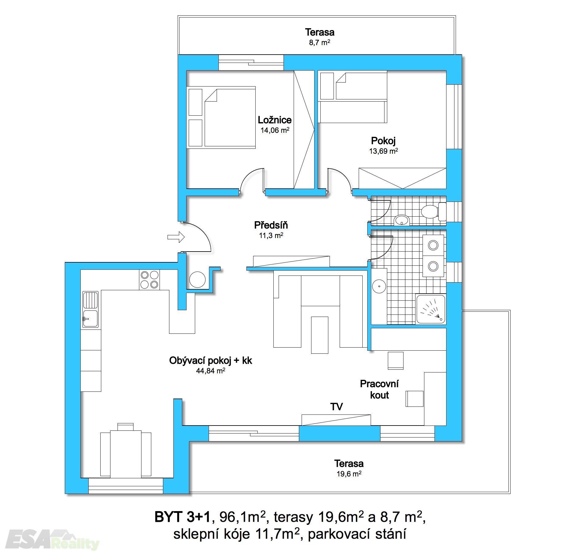 Prodej bytu 3+1, 96,1m2, terasy 19,6m2, 8,7m2, sklepní kóje 11,7m2, park. stání, Benátky nad Jizerou