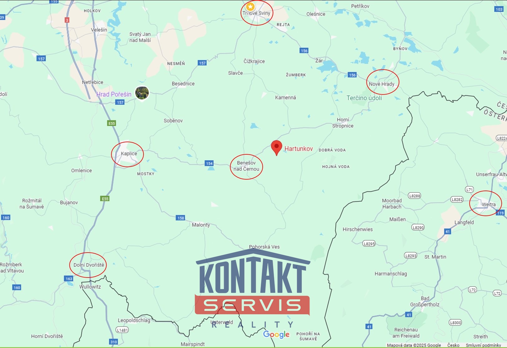 V zastoupení klienta vám nabízíme ke koupi výjimečný stavební pozemek v jedné z nejkrásnějších lokalit jižních Čech - v malebné obci Hartunkov u Benešova nad Černou, přímo v srdci Novohradských hor. Pozemek je připraven k okamžité výstavbě! Studna i elektrické připojení jsou již na pozemku, což vám ušetří nejen čas, ale i značné finanční prostředky při realizaci vašeho projektu. Hartunkov je skutečným klenotem Novohradských hor. Obklopuje vás nedotčená příroda, čistý vzduch a klid, který dnes najdete jen málokde. Přesto zůstáváte v dosahu civilizace. Benešov nad Černou je vzdálen pouhé 3 km. Pozemek je ideální jak pro stavbu rekreační chaty pro víkendové pobyty, tak pro rodinný dům k trvalému bydlení. Rozhodnutí je pouze na vás! Výměra 391 m² je ideální pro pohodlný rodinný dům se zahradou nebo prostornou chatu s dostatkem místa pro relaxaci. Pro více informací nás kontaktujte a domluvte si prohlídku!