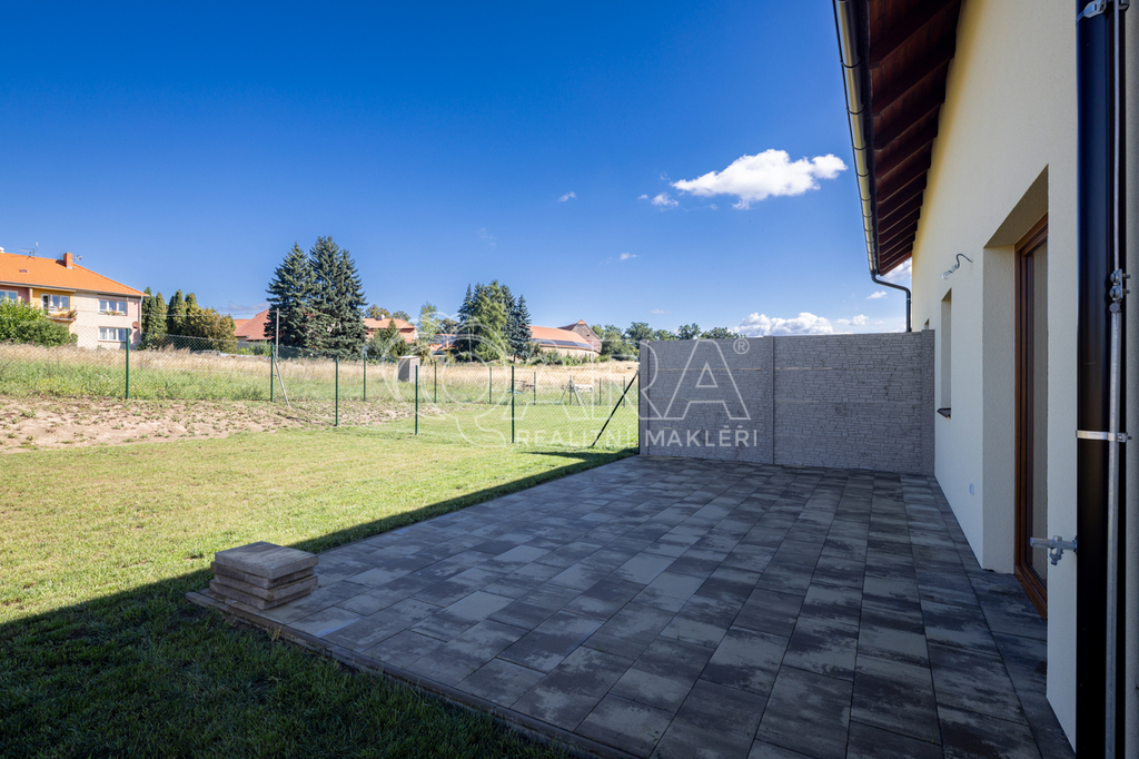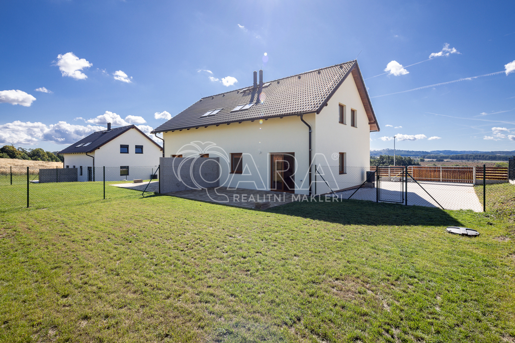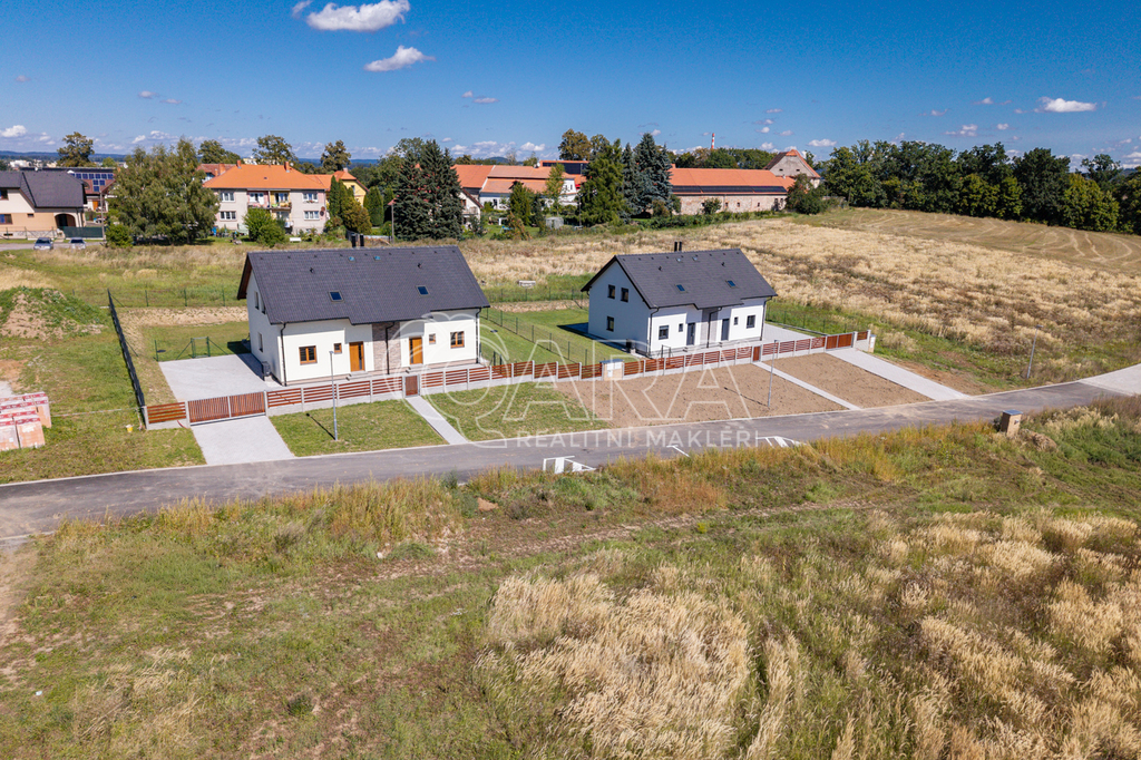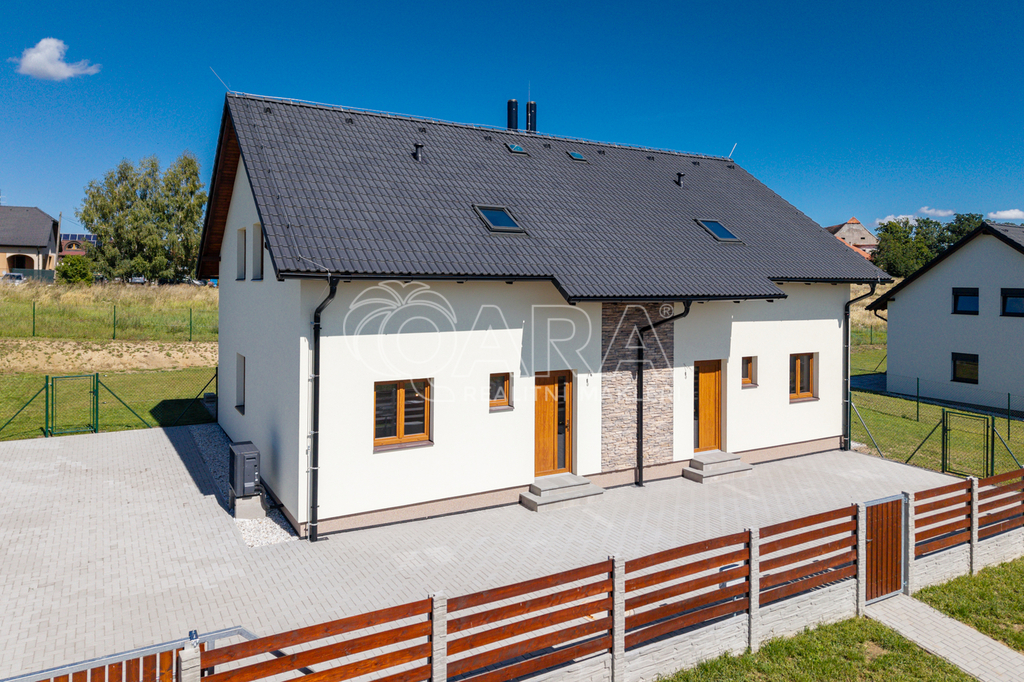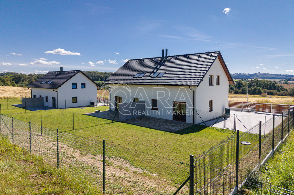 REZERVOVÁNO Exkluzivní nabídka prodeje novostavby rodinného domu koncipovaného jako polovina dvojdomku (vchod A) v nově vznikající zástavbě v Benešově na Mariánovicích. Dům o dvou podlažích (1. NP 54 m², 2. NP 50 m²) je dispozičně řešen jako 4+kk, přičemž v přízemí se nachází společenská zóna: obývací pokoj s kuchyňským koutem, předsíň, samostatné WC a technická místnost. V patře jsou tři samostatné ložnice a velkorysá koupelna se sprchovým koutem (v koupelně je také skrytá příprava pro vanu) a s WC. Téměř v celém domě je položena rigidní vinylová podlaha, v předsíni, technické místnosti a v koupelně je dlažba. V půdním prostoru je vytvořena pochozí půda o velikosti cca 25 m² k ukládání sezónních věcí. Vytápění domu a ohřev teplé vody zajišťuje tepelné čerpadlo Panasonic (v obou podlažích je teplovodní podlahové vytápění, v koupelně je topný žebřík). Jako alternativní zdroj vytápění je možné nainstalovat krbová kamna (komín je připraven). Dům je připojen na obecní vodovod a kanalizaci. Dům je francouzským oknem v obývacím pokoji přirozeně propojen se zahradou o velikosti 239 m² (jedná se o čistou plochu zahrady ve které není započítána zastavěná plocha, parkoviště a prostor před domem), jejíž součástí je na dům navazující 28 m² vydlážděná terasa, díky jejíž severní orientaci si můžete venkovní prostor užít i v horké a slunné dny. Zahrada je kompletně oplocená, zatravněná a čeká na případné finální úpravy od nových majitelů. Akumulační nádrž (3 m3) pro budoucí hospodaření s dešťovou vodou je již na pozemku umístěna. Před domem se dále nacházejí dvě parkovací stání (vjezd je společný pro celý dvojdomek), přičemž další možnosti parkování jsou v široké ulici před domem. Dům slibuje bezproblémový a nákladově příznivý provoz (energetická náročnost B). Dům je dokončen a připraven na předání novým majitelům. Zkolaudováno v listopadu 2025. Mariánovice jsou poměrně novou a stále se utvářející rezidenční lokalitou na jižním okraji Benešova, kde žijí převážně rodiny s dětmi. Veškerá občanská vybavenost se nachází v pár minut cesty autem vzdáleném centru Benešova, kam se lze také dopravit MHD, která má na Mariánovicích 2 zastávky. BUS MHD zastavuje přímo před spádovou základní školou (8 minut), dále pak další 2 minuty pokračuje na Terminál, což je spojené autobusové a vlakové nádraží (rychlík na Hlavní nádraží cca 35 minut). Hypotéka možná, rádi zařídíme. Většina bank zvýhodňuje pořízení nemovitosti v energetické třídě B slevou z úrokové sazby (cca ve výši 0,2 %)