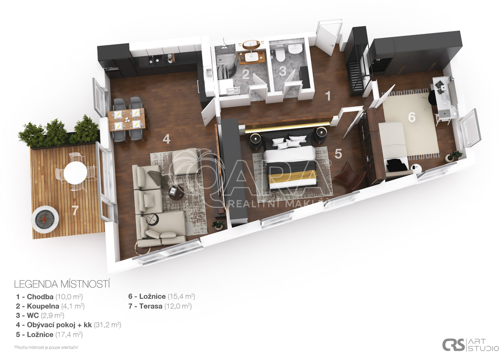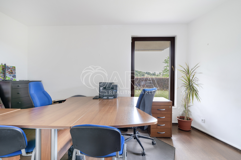 Sen nejen náruživého golfisty se brzy může stát skutečností. V areálu soukromého golfového resortu v Berouně si můžete koupit prostorný byt 3+kk o ploše 81 m2, ke kterému patří předzahrádka 90 m2, sklep 5,5 m2 a parkovací stání. Buď pro vlastní bydlení nebo jako investiční. Z ložnice to budete mít na hřiště co by míčkem dohodil... Při koupi tohoto bytu získáte kromě bohatého příslušenství i atraktivní kombinaci sportovního vyžití (golf, plážový volejbal, fitness a bazén v klubovně, cyklovýlety a výběhy do okolí apod.), krásné a klidné lokality obklopené lesy, blízkosti města s veškerou občanskou vybaveností, dobré dojezdové vzdálenosti do Prahy a také bezpečí, protože byt se nachází v soukromém areálu za závorou. Umístění bytu je vskutku netradiční – nad městem Beroun v areálu privátního golfového resortu. Hned vedle klubovny a hřiště, obklopen krásnou přírodou a lesy, a přitom pár minut do centra Berouna nebo na dálnici D5, po které jste za čtvrt hodiny v Praze. Byt, kolaudovaný v roce 2014, má dispozici 3+kk a je opravdu prostorný – předsíň má 10 m2, ložnice 17,4 a 15,4 m2, obývák s budoucím kuchyňským koutem 31,2 m2, koupelna 4,1 m2 a WC s pračkou 2,9 m2. Dále k bytu patří velký sklep 5,5 m2 a výjimečně i předzahrádka 90 m2, jejíž součástí je terasa o ploše cca 12 m2. Obývací pokoj a předzahrádka jsou orientované na jihozápad, pokoje na severovýchod a jihovýchod. V areálu za závorou budete mít i vlastní parkovací stání. Pokud jste aktivní golfisté a chcete koupit byt primárně kvůli kvůli blízkosti soukromého hřiště a klubu, tak vězte, že díky vlastnictví bytu máte nárok na atraktivní výhody – celoživotní členství za polovic, roční hrací poplatek také (cca 35 000 Kč), slevu 20% v restauraci, vstup zdarma do wellness (dvě vířivky, sauna, masérna, venkovní bazén a fitness), buggy za 200 Kč atd. I jako rezidenti negolfisti máte zajímavé výhody - přístup do wellness centra (sauna, fitness, whirlpool) a na beach volejbalové hřiště, bezplatné využití venkovního bazénu, 20% slevu v restauraci (veřejná část) a také možnost využití golfového hřiště ve všední dny (Po-Čt) v době do 14:00 hodin se slevou na aktuální fee 20%. Provozní náklady jsou rozumné. Měsíčně zaplatíte za byt asi 3 900 Kč včetně fondu oprav (navíc je jen elektřina a internet) a za sklep asi 300 Kč. Energetická náročnost budovy je třída B. Nyní je v bytě kancelář a současný majitel se nebrání prodloužení nájmu, pokud byt koupíte jako investici. Pokud zde budete chtít bydlet, majitel samozřejmě kancelář vyklidí. Přijďte se sami přesvědčit.