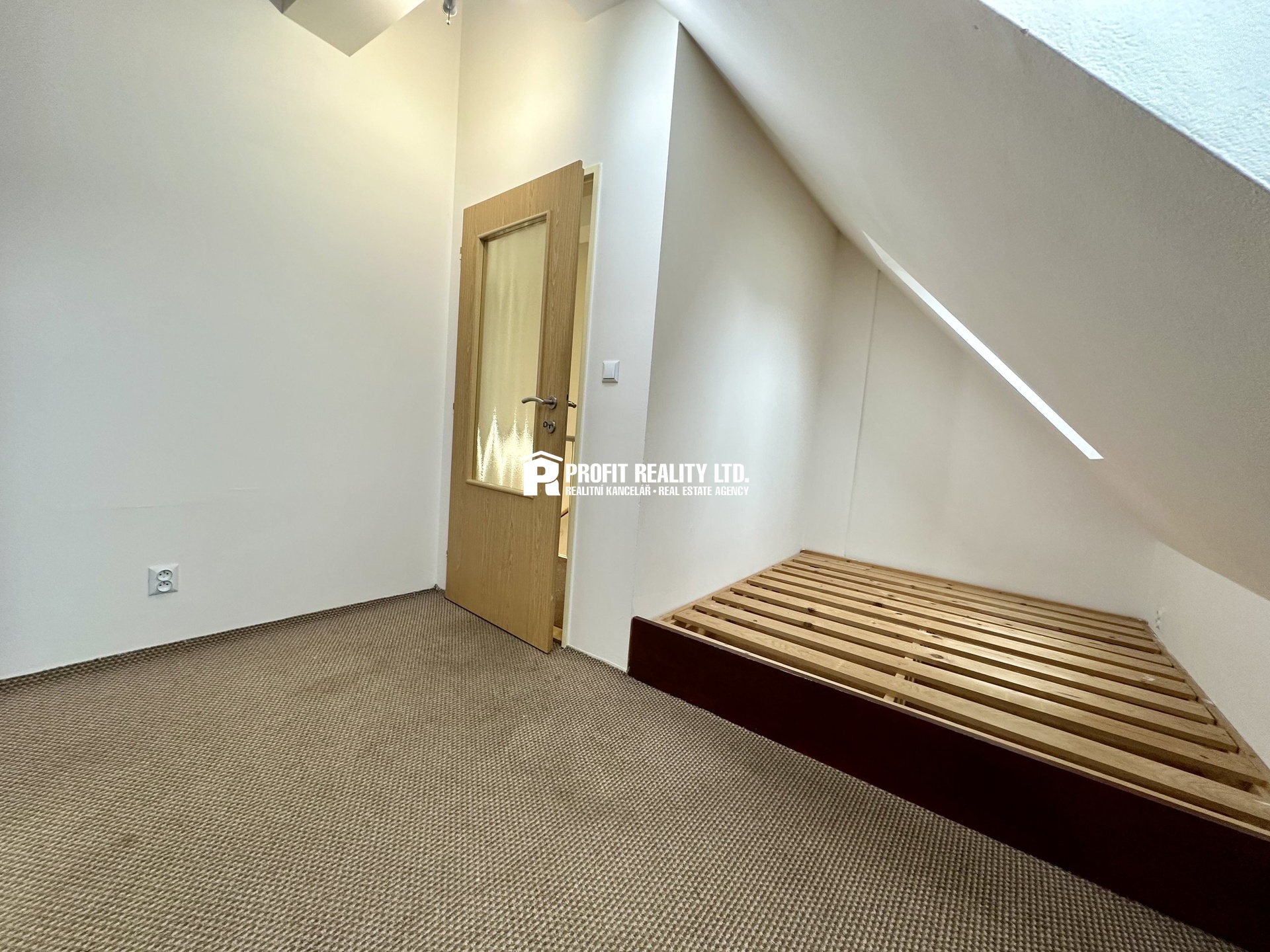 Zprostředkujeme vám prodej družstevního bytu o dispozici 2 + kuchyňský kout, který se nachází ve 4. NP bytového domu umístěného v historickém centru města Beroun. Výměra bytu činí 57 m2. Podkrovní byt se skládá ze vstupního schodiště, obývacího pokoje s kuchyňským koutem, menší ložnice ve tvaru písmene L a prostorné koupelny s vanou a toaletou. Kuchyňský kout je vybaven kuch. linkou. V ložnici je umístěna vestavná skříň. Bytový dům je ve velmi dobrém technickém stavu (nový plynový kotel ve vlastní kotelně). Jedná se o družstevní vlastnictví (anuita splacena). V domě je k dispozici společná kolárna, prostor pro uložení odpadu. Velkou předností domu je udržovaná společná zahrada ve vnitrobloku, kde je možnost užívání bazénu, altánu či grilu. Dům se nachází v centru města a veškerá občanská vybavenost je v dochozí vzdálenosti. Nájezd na D5 je vzdálen 1 km.