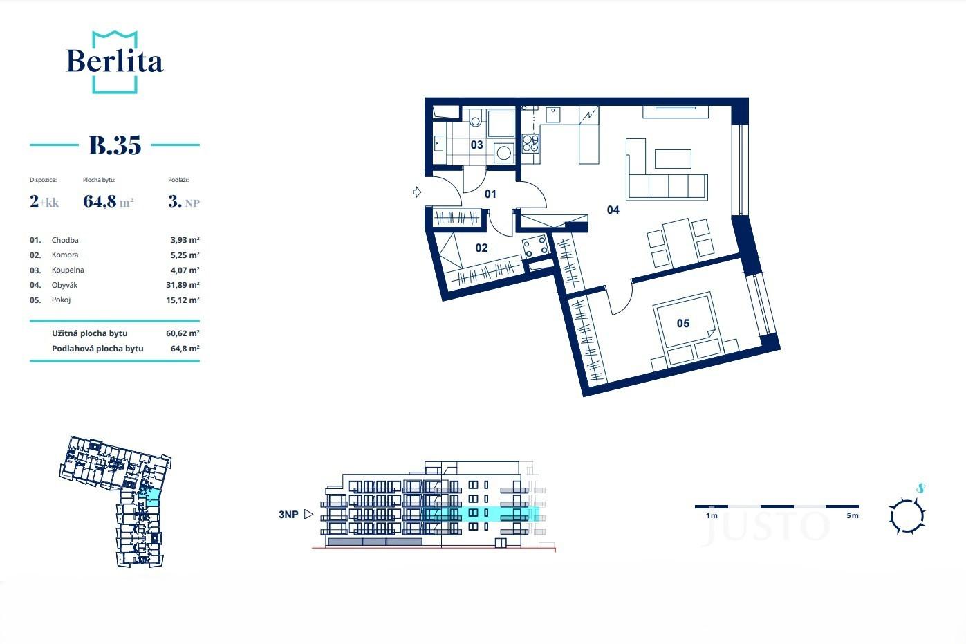 Nájemce NEplatí provizi. Ušetřete jeden měsíční nájem + DPH. Prohlídkový den: 16. a 17. února 2026. Rezervujte si termín prohlídky včas. Ve výhradním zastoupení majitele Vám nabízíme k pronájmu moderní byt 2+kk o rozloze 64 m², situovaný ve 3. nadzemním podlaží novostavby z roku 2022. Dům je součástí prémiového rezidenčního projektu BERLITA. Přístup je zajištěn výtahem přímo z garáží nebo z uzavřeného dvora, který je určen výhradně pro rezidenty. Dispozice bytu je detailně promyšlená a velkorysá – prostorný obývací pokoj s kuchyňským koutem je doplněn o nadstandardně velkou jídelní část s elegantním stolem. Díky velkformátovým oknům je interiér prosvětlený po celý den. Vysoké stropy (2,70 m) umocňují pocit vzdušnosti. K dispozici je také praktická komora téměř o velikosti samostatného pokoje. Byt je kompletně vybaven nábytkem a spotřebiči – moderní kuchyňská linka s indukční varnou deskou, myčkou, inteligentní mikrovlnnou troubou, pohodlná sedačka, televize. Po dohodě je možné doplnit další úložné prostory nebo vytvořit pracovní kout v ložnici. Koupelna nabízí komfortní sprchový kout (90×90 cm), zrcadlovou skříňku, otopný žebřík a automatickou pračku. Díky modernímu systému ohřevu vody je zajištěna její stálá dostupnost. Budova spadá do energetické třídy B – velmi úsporná. Individuální nastavení vytápění, rekuperace tepla, okna s izolačním trojsklem a elektrické předokenní žaluzie přispívají k nízkým provozním nákladům. Lokalita nabízí výjimečnou dostupnost – historické centrum Berouna je vzdáleno pouhých 5 minut chůze. V bezprostředním okolí najdete obchody (Albert, Billa), oblíbené restaurace (Blackdog, Na baště), kavárny, vinárnu Barrande, aquapark i zimní stadion. Autobusové a vlakové nádraží, odkud jezdí spoje do Prahy, jsou jen 10 minut chůze od domu. Výborné spojení do Prahy po dálnici D5 Vám umožní dojet autem do metropole za 20 minut. Volnočasové aktivity zahrnují tenisové kurty, cyklostezky směrem na Srbsko či Nižbor, výlety na Karlštejn nebo do malebného okolí řeky Berounky. Možnost pronájmu širokého krytého garážového stání, vhodného i pro SUV, za 1.000 Kč/měsíc. V případě zájmu o prohlídku bytu vyplňte kontaktní formulář na této webové stránce a do 20 minut obdržíte pokyny pro online rezervaci termínu Vaší prohlídky. Identifikační číslo nemovitosti: J11125.