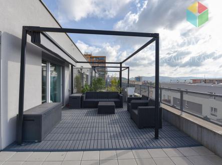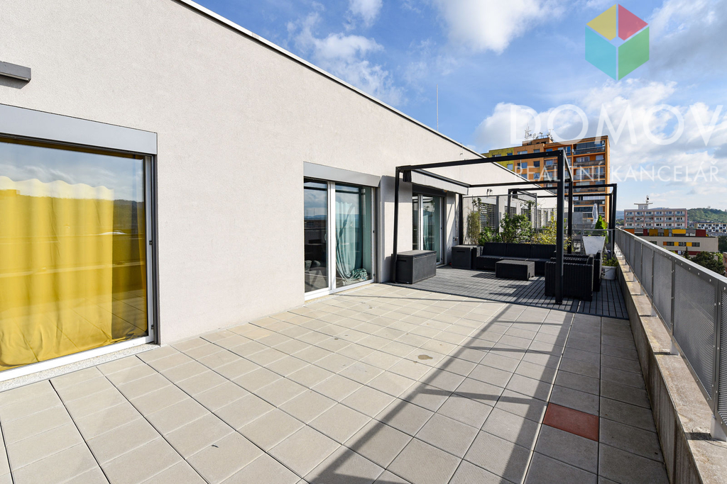 Nabízíme Vám k pronájmu opravdu pěkný byt o výměře 54,1 m2 s prostornou terasou a nádherným výhledem. Terasa má výměru 46,4 m2, je na ní venkovní posezení s osvětlenou pergolou se zatahovací střechou a další relaxační prostor. Vstup na terasu je z obývacího pokoje i z ložnice, na oknech jsou venkovní žaluzie. Byt se nachází v nejvyšším 5. NP bytového domu s výtahem, který byl kolaudovaný v roce 2020. Dům je bezbariérový, výtahem se dostanete až do garáže, kde v ceně máte vlastní parkovací místo. K bytu patří také sklepní koje. Dispozičně je byt řešen jako 2+kk, kde se z chodby dostanete do ložnice (ta má šatnu), do koupelny (s vanou a toaletou) a do hlavního obytného prostoru, který je rozdělen na odpočinkovou, jídelní a kuchyňskou část. Kuchyňská linka je světlé barvy, má prostorné skříňky a kvalitní spotřebiče. Místnosti mají francouzská okna, která zajišťují dostatek denního světla, byt je opravdu příjemně světlý a díky velké terase je jedinečný. A pozor - byt je kompletně vybaven, stačí si pořídit televizi, pračku a sedací soupravu a jinak máte vše v bytě k dispozici. A to včetně zahradního nábytku na terase, botníku, dvoulůžka, knihovny, stolu, židlí, stolku, skříněk, závěsů a svítidel. Lokalita Máchovna - Nepilova ulice je v Berouně oblíbená, v blízkosti je sportovní centrum, autobusová zastávka, obchodní centrum. Volné od 1.2.2026. Vhodné pro 1-2 osoby, nekuřáky, bez zvířat.