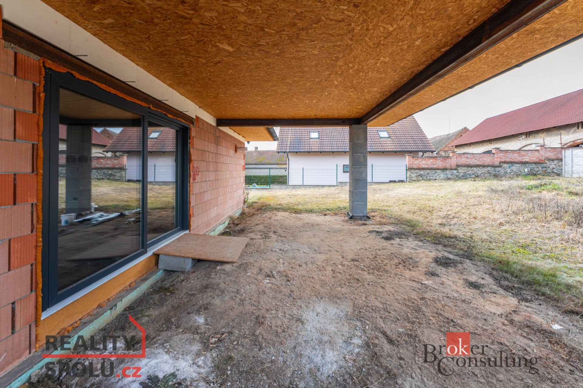 Nabízím k prodeji moderní jednopodlažní rodinný dům v obci Bezděkov u Pardubic, situovaný na rovinatém pozemku o výměře 900 m². Jedná se o novostavbu před kolaudací s užitnou plochou 123,75 m². Dispozice domu je prakticky řešena. Po vstupu se nachází zádveří a chodba, která propojuje jednotlivé místnosti – pracovnu, samostatný pokoj, ložnici, koupelnu s WC a technickou místnost, ve které je umístěno další WC. Dominantou domu je prostorný obývací pokoj s kuchyňským koutem a navazující komorou. Podkroví je pochozí a nabízí dostatek úložného prostoru. Nemovitost je napojena na veřejný vodovod, elektřinu a kanalizaci. V domě je připraveno tepelné čerpadlo určené pro vytápění podlahovým topením. Alternativně lze využít také krbovou vložku, přičemž přikládání je řešeno z technické místnosti, což umožňuje zachovat čistotu v obytném prostoru. Do technické místnosti vede samostatný vstup také z venkovní části domu. Pro úspěšnou kolaudaci je nutné dokončit finální podobu fasády, zapojit tepelné čerpadlo, osadit retenční nádrž a realizovat příjezdovou komunikaci včetně pochozích ploch kolem domu. Současně je potřeba dokončit finální úpravy v koupelně a technické místnosti, položit podlahové krytiny a osadit vnitřní dveře. PVC podlahová krytina je již zakoupena a připravena k instalaci. Na obytnou část navazuje zastřešená terasa určená k venkovnímu posezení a odpočinku. V rohu zahrady je připraven vybetonovaný základ pro budoucí zahradní domek. Dům nabízí moderní a energeticky úsporné bydlení v klidné lokalitě s dobrou dostupností do Pardubic. V případě zájmu zajistím kompletní realitní i finanční servis.