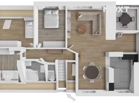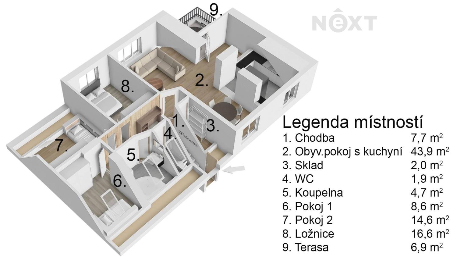 Exkluzivně Vám nabízíme k prodeji byt 4+kk v osobním vlastnictví o přibližné užitné ploše 143,9 m2 vč. příslušenství: terasa, sklep, který se nachází v žádané a klidné části města Břeclav, v těsné blízkosti centra. Byt se nachází v 5.NP z 5.NP cihlového domu bez výtahu. Tento prostorný byt je ideální jak pro větší rodinu, tak i jako investiční příležitost, protože díky stavební úpravě lze současnou dispozici rozdělit na dvě menší bytové jednotky. Byt je velmi udržovaný a po částečné rekonstrukci: rozvody vody, elektřiny a odpadů, omítky, dveře. Vizualizace v inzerci Vám nejlépe napoví pro představu budoucí stav nemovitosti. K dispozici je chodba (7,7 m2), obývací pokoj s kuchyňským koutem (43,9 m2), komora (2 m2), dva pokoje (8,6 m2, 14,6 m2), ložnice (16,6 m2), koupelna s rohovou vanou (4,7 m2) a samostatné WC (1,9 m2). K bytu navíc náleží sklep (6,9 m2) a terasa (21 m2) s výhledem do okolí. Dům je po částečné revitalizaci – stoupačky, poštovní schránky, plastová okna, střecha. Vytápění bytu je ústřední, zajištěno vlastním kondenzačním kotlem umístěným přímo v bytě. Parkování je možné před domem nebo v bezprostřední vzdálenosti. V blízkém okolí je veškerá občanská vybavenost – obchody, škola, školka, lékař, dětská hřiště, parky a mnoho možností pro sportovní a kulturní aktivity. Vše je kousek dostupné, co se týká centra nebo školy, obchodů i lékaře, ale i autobusové zastávky, kavárna, fitko či hráze, kde je možnost na procházky kolem vody. Průkaz energetické náročnosti nebyl dodán, z toho důvodu je uvedena třída G. S financováním nemovitosti Vám velmi rádi pomůžeme. Při osobní prohlídce nejlépe posoudíte, zda je tento byt vhodný právě pro Vaše nové bydlení. Pro více informací nebo sjednání prohlídky kontaktujte realitního makléře. Pro komunikaci uvádějte evidenční číslo zakázky N114164.