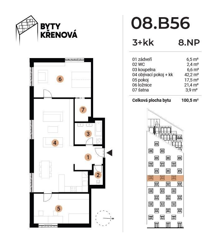 Přestavujeme Vám pokračování úspěšného projektu LOFT BLOK Křenová. Ikonická stavba, která přináší do centra města moderní design a výhledy, které vás nepřestanou bavit – Petrov, Špilberk i celé panorama Brna máte doslova na dosah. Tento projekt spojuje špičkovou architekturu, promyšlené dispozice a nadstandardní technické řešení. Ať už hledáte nový domov, nebo investici, která si drží hodnotu, tady najdete obojí – v té nejlepší brněnské lokalitě ve středu města. Bytová jednotka o dispozici 4+kk a velikosti 98,6 m2 se nachází v 7.NP z celkových 16.NP. Díky umístění ve vyšším podlaží se můžete těšit na krásný výhled směrem na město a dostatek denního světla. Standard bytu Světlé prostory, kvalitní vinylové podlahy a keramická dlažba Interiérové dřevěné dveře s obložkovými zárubněmi Bezbariérový přístup se dvěma výtahy Kompletní příprava na kuchyň a digestoř Klimatizace Centrální vytápění napojené na městskou teplárnu Optický internet, TV a audiotelefon u vstupu Možnost dokoupení garážového parkovacího stání a sklepní jednotky Jen pár kroků od Vašeho prahu naleznete kavárny, restaurace, obchody, dětská hřiště i zelené plochy pro relaxaci. Stačí nasednout na kolo a po přilehlé cyklostezce vyrazíte k brněnské přehradě či do klidných lesů Hádů. Moderní bydlení v centru Brna tak spojuje to nejlepší z nejlepší z — dynamiku velkoměsta a klid domova, který se Vám nikdy neomrzí. Do úplného centra Brna se dostanete za pár minut pěšky nebo tramvají, přičemž zastávky MHD se nacházejí v těsné blízkosti projektu. Hlavní vlakové a autobusové nádraží jsou vzdáleny jen pár minut chůze, což zajišťuje vynikající napojení nejen v rámci města, ale i na dálkové spoje. Autem jste na dosah městskému okruhu i nájezdům na dálnice D1 a D2. Ať už míříte do Prahy, Vídně nebo Bratislavy, hladké napojení Vám každý den ušetří cenný čas. Lokalita s vysokým potenciálem rozvoje – v blízkosti se plánují nové služby a vznikají další příležitosti, které zvýší komfort bydlení v docházkové vzdálenosti. Podívejte se na kompletní nabídku dalších jednotek na webu projektu BYTYKRENOVA.CZ – naleznete tam různé dispozice i velikosti, ze kterých si určitě vyberete. Předpokládaný termín dokončení je začátek roku 2027. Neváhejte nás kontaktovat – poradíme Vám s výběrem Vašeho vysněného bydlení či investice.