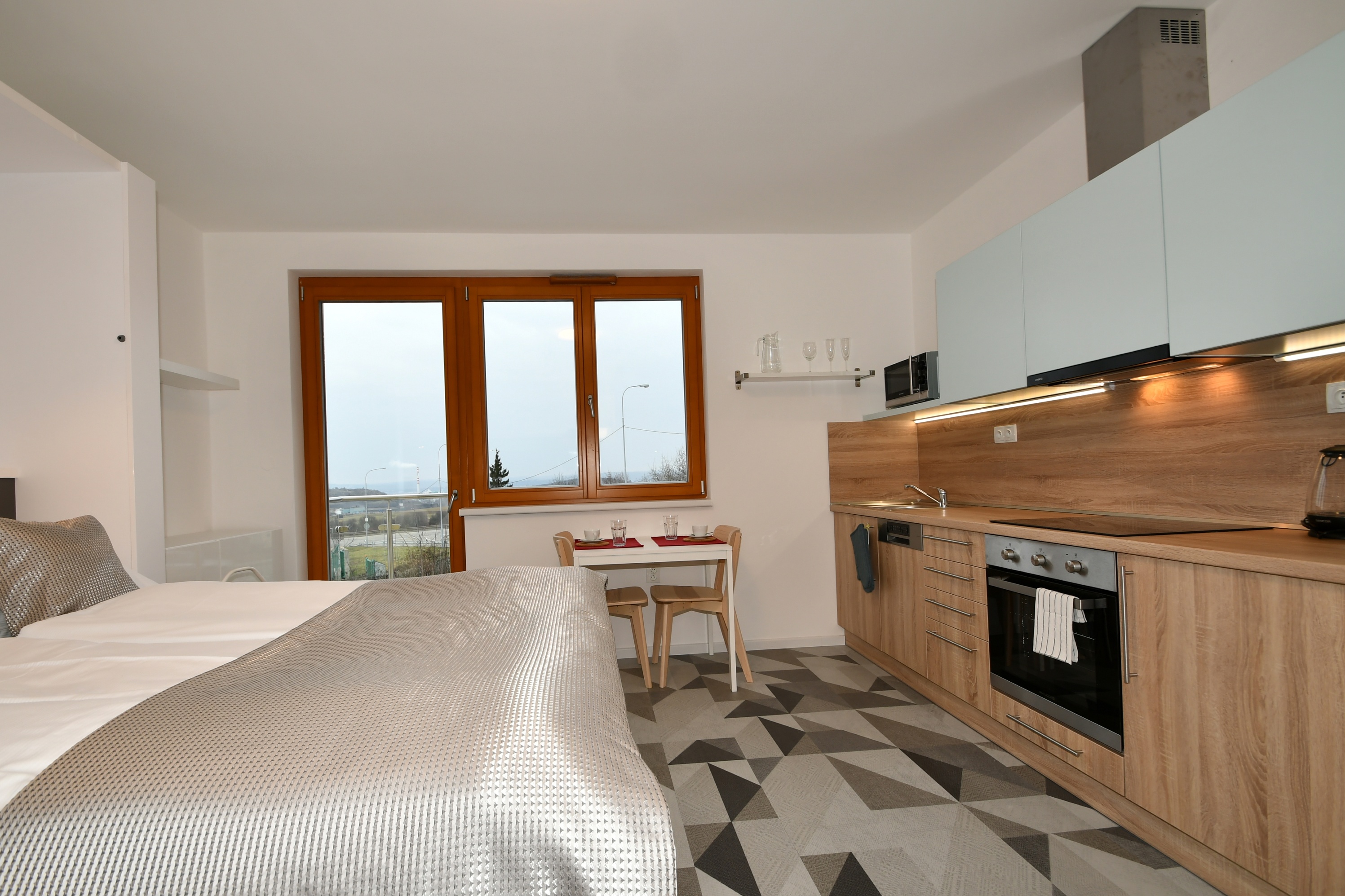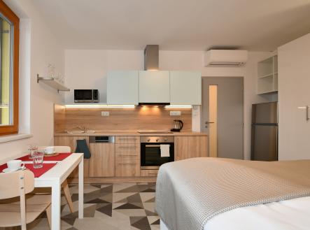 Hledáte moderní byt Brno-Líšeň s balkonem, chytrou domácností a úsporným provozem? Nabízíme dokončený byt 1+kk v novostavbě EFI Residence Holzova 28, zkolaudované v září 2022. Tento byt v prvním patře domu spojuje praktické řešení prostoru, kvalitní technické vybavení a výhled na město Brno. Dispozice a vybavení Byt má celkovou podlahovou plochu 32 m2, k tomu balkon 2,5 m2 a sklepní kóji 2,3 m2. Obývací pokoj s kuchyňským koutem (19,5 m2) je vybaven kuchyňskou linkou včetně spotřebičů: indukční varná deska, horkovzdušná trouba, digestoř, myčka nádobí a dřez. Z pokoje je vstup na balkon 2,5 m2, orientovaný na západní stranu s krásným výhledem na město Brno. Koupelna (4,7 m2) je vybavena vanou, umyvadlem a WC. V předsíni (6,2 m2) je umístěn dveřní videotelefon a přípojka na pračku. O vytápění se stará podlahové topení s plynovým kondenzačním kotlem Baxi Nuvola Duo-tec se zásobníkem teplé vody. O chlazení se stará klimatizační jednotka Daikin. Byt je vybaven systémem chytré domácnosti SIEMENS, který umožňuje pohodlně ovládat topení, chlazení i stínění oken z jednoho místa. Dřevěná okna s trojskly doplňují elektricky ovládané předokenní žaluzie VEKRA, které zajišťují soukromí a akustický komfort. V bytě jsou vinylové podlahy. Sklep a parkování K bytu náleží sklepní kóje 2,3 m2 umístěná v suterénu domu. Součástí nabídky je možnost koupě vlastní garáže s dálkově ovládanými sekčními vraty a vjezdem z dvorní části objektu. K dispozici jsou garáže o ploše od 19,5 m2, s cenou od 1 171 800 Kč. Lokalita: Brno-Líšeň Městská část Líšeň patří mezi nejžádanější rezidenční oblasti Brna. Nabízí klidné prostředí, kompletní občanskou vybavenost a skvělou dopravní dostupnost. Zastávky MHD jsou v blízkosti, centrum i dálnice D1 jsou snadno dosažitelné. Pro volný čas potěší blízkost Mariánského údolí a okolních lesů navazujících na CHKO Moravský kras. Shrnutí Dispozice: 1+kk, 32 m2 + balkon 2,5 m2 + sklep 2,3 m2 Kolaudace: 2022 Vybavení: kuchyňská linka se spotřebiči, AC Daikin, podlahové topení Baxi, Smart Home Siemens, žaluzie VEKRA Parkování: možnost dokoupení garáže od 1 171 800 Kč. Lokalita: Brno-Líšeň, ul. Holzova Moderní byt s balkonem a výhledem na město, vybavený chytrou domácností a klimatizací, ideální pro singles, mladé páry nebo investory.