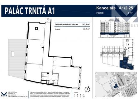 V novém developerském projektu Palác Trnitá, který najdete v hlavní rozvojové zóně města Brna, v těsném sousedství historického centra města Brna a NC Vaňkovky, nabízíme prodej kancelářského prostoru o výměře 207 m2, který se nachází ve 2. NP se vstupem z ulice Trnitá. K prostoru náleží velkorysá terasa o výměře 64 m2 orientovaná do klidného vnitrobloku. Kancelářský prostor nabízíme ve standardu shell and core, možnost dokoupení GS. K dispozici ihned.