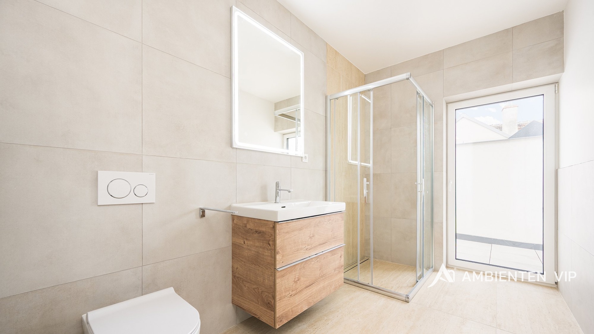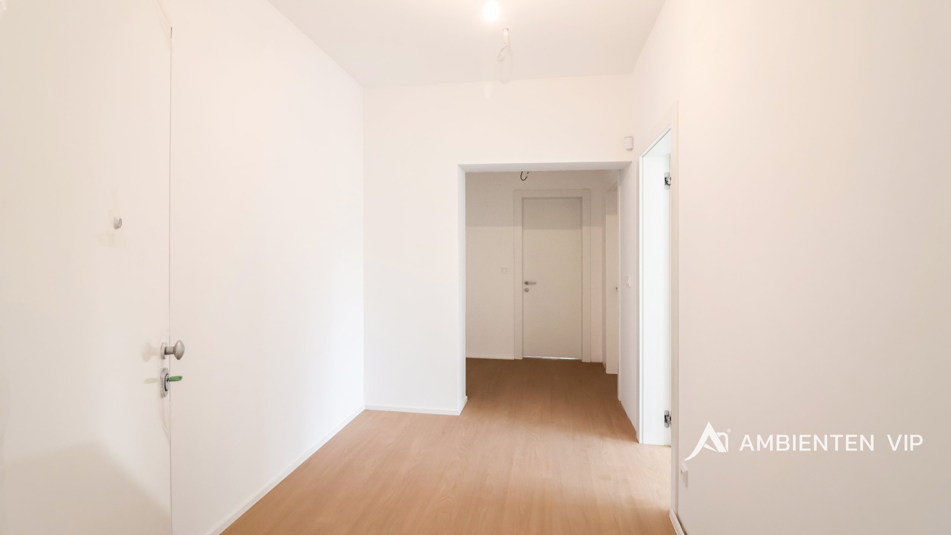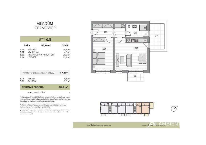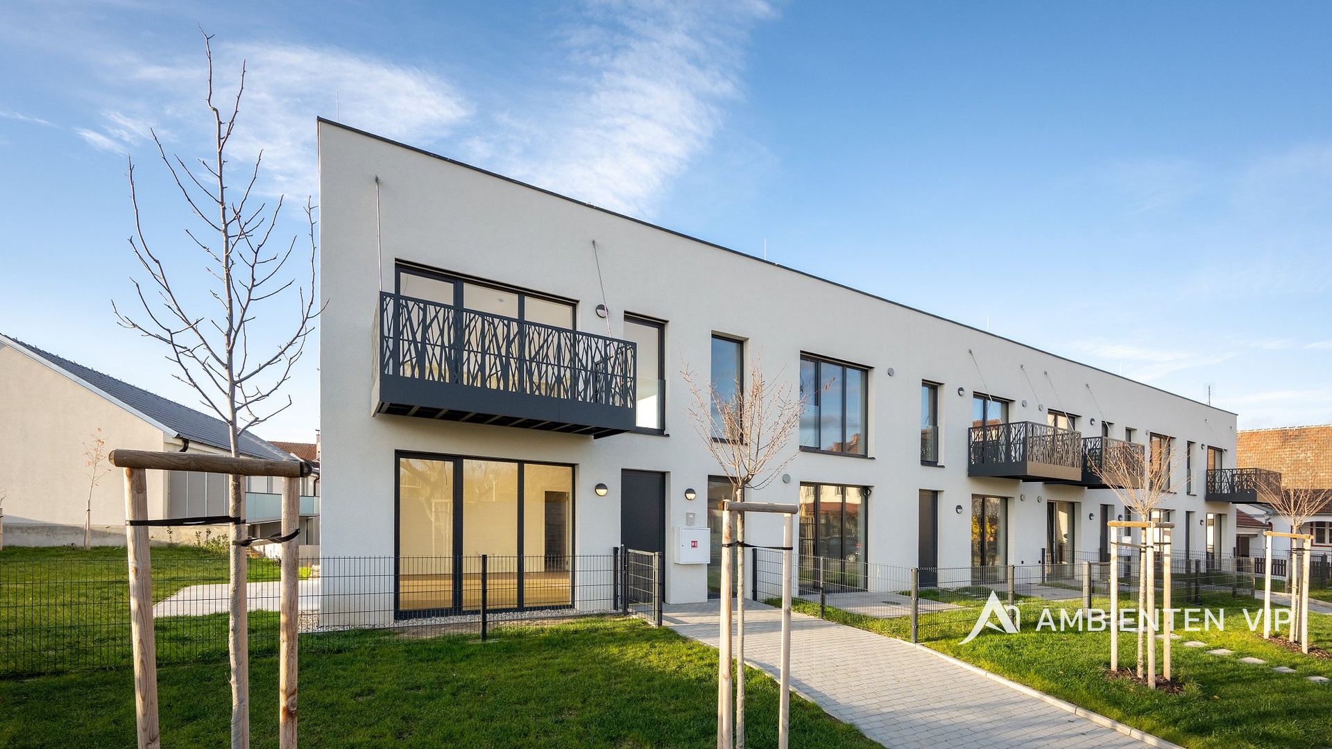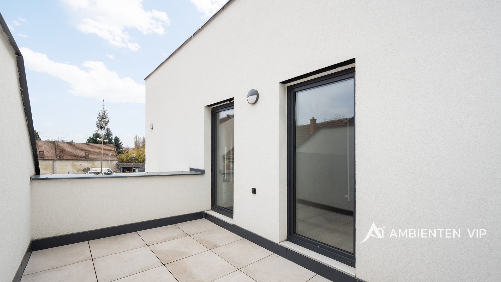 AMBIENTEN VIP Vám ve výhradním zastoupení majitele nabízí bytovou jednotku o dispozici 2+kk, která se nachází ve 2. nadzemním podlaží a její podlahová plocha činí 67,2 m². Díky terase o velikosti 9,81 m² a balkonu o velikosti 3,64 m² se celková plocha bytu rozšiřuje na 80,65 m². Dispozice bytu je navržena s důrazem na praktičnost i pohodlí moderního bydlení. Po vstupu Vás přivítá prostorná chodba o velikosti 10,93 m², kde je zároveň připravena instalace pro pračku a sušičku. Obývací pokoj s kuchyňským koutem o rozloze 26,78 m² je centrálním místem bytu a disponuje vstupem na balkon (3,64 m²) i na prostornou terasu (9,81 m²). Ložnice o velikosti 17,24 m² je situována do klidné části bytu a poskytuje dostatek prostoru pro odpočinek. Koupelna o rozloze 6,56 m² je vybavena moderním walk-in sprchovým koutem, závěsným WC a elegantní keramickou dlažbou. Ze samotné koupelny je rovněž přístup na terasu, což dodává prostoru vzdušnost a přirozené světlo. Venkovní parkovací stání se nachází přímo v uzavřeném areálu před viladomem a je zabezpečeno dálkově ovládanou závorou. Vytápění a ohřev teplé vody je řešen společným tepelným čerpadlem vzduch–voda, které slouží celému bytovému domu o osmi jednotkách. Okna jsou plastová s izolačním trojsklem, s přípravou na venkovní žaluzie a zapuštěnými garnýžemi. Vstupní dveře jsou bezpečnostní a protipožární, interiérové dveře jsou bezfalcové a vybavené magnetickým zámkem. Podlahy v obytných místnostech jsou vinylové, v koupelně keramická dlažba. Bezpečnostní systém bytu je zajištěn instalací Jablotronu, a vstup do objektu kontroluje centrální videotelefon s kamerou. Pro internetové připojení a televizi je v bytě připravena kompletní datová infrastruktura. Celý dům je moderní cihlová novostavba. Městská část Brno – Černovice nabízí kompletní občanskou vybavenost – v pěší dostupnosti se nachází základní i mateřské školy, obchody, kavárny, restaurace, pošta, lékárna, zdravotní středisko i různá sportoviště. Okolí je vhodné jak pro každodenní život, tak pro volnočasové aktivity – v blízkosti najdete například Černovický hájek, nový park na Charbulově ulici, cyklostezky nebo dětská hřiště. Dopravní obslužnost je zde výborná – zastávka MHD je vzdálena přibližně 2 minuty chůze, do centra města se dostanete pohodlně za 7 minut autem nebo cca 15 minut MHD. Lokalita má navíc velmi dobré napojení na dálnice D1 a D2, což ocení zejména ti, kteří dojíždějí mimo Brno. Hledáte-li byt v soukromí s výbornou dostupností, tak je tento byt určený právě pro Vás. V případě zájmu o více informací či termín prohlídky, neváhejte nás kontaktovat!