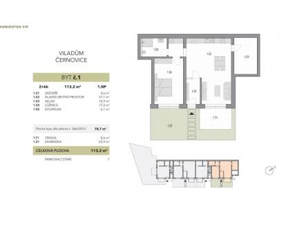 AMBIENTEN VIP si Vám dovoluje ve výhradním zastoupení majitele nabídnout jednotku o dispozici 2+kk s terasou, zahrádkou a jedním venkovním parkovacím stáním v nově postaveném luxusním vila domě na Faměrově náměstí v městské části Brno – Černovice. Bytová jednotka se nachází v 1. nadzemním podlaží (1.NP) a její podlahová plocha činí 78,7 m². S terasou o velikosti 8,6 m² a zahradou o rozloze 25,90 m² se celková plocha rozšiřuje na 113,2 m². Byt nabízí praktické zádveří, prostorný obývací pokoj s moderním kuchyňským koutem, sklad, ložnici, koupelnu s toaletou. Z obývacího pokoje i ložnice je přímý vstup na terasu o velikosti 8,6 m², která navazuje na soukromou zahradu o rozloze 25,9 m². Venkovní parkovací stání se nachází přímo v uzavřeném komplexu před viladomem a je zabezpečeno dálkově ovládanou závorou. Vytápění a ohřev teplé vody je řešen společným tepelným čerpadlem vzduch–voda, které slouží celému bytovému domu o osmi jednotkách. Okna jsou plastová s izolačním trojsklem, s přípravou na venkovní žaluzie a zapuštěnými garnýžemi. Vstupní dveře jsou bezpečnostní a protipožární, interiérové dveře jsou bezfalcové a vybavené magnetickým zámkem. Koupelna je vybavena moderním walk-in sprchovým koutem, keramickou dlažbou a obklady, závěsným WC a přípravou na pračku a sušičku. Podlahy v obytných místnostech jsou vinylové, v koupelně a na toaletě keramická dlažba. Bezpečnostní systém bytu je zajištěn instalací Jablotronu, a vstup do objektu kontroluje centrální videotelefon s kamerou. Parkování je zajištěno vlastním venkovním stáním v uzavřeném areálu s dálkově ovládanou závorou. Spoluvlastnický podíl na zahradě o rozloze přibližně 1000 m² nabízí příjemné místo k odpočinku i zábavě, včetně dětských herních prvků. Pro internetové připojení a televizi je v bytě připravena kompletní datová infrastruktura. Celý dům je moderní cihlová novostavba. Městská část Brno – Černovice nabízí kompletní občanskou vybavenost – v pěší dostupnosti se nachází základní i mateřské školy, obchody, kavárny, restaurace, pošta, lékárna, zdravotní středisko i různá sportoviště. Okolí je vhodné jak pro každodenní život, tak pro volnočasové aktivity – v blízkosti najdete například Černovický hájek, nový park na Charbulově ulici, cyklostezky nebo dětská hřiště. Dopravní obslužnost je zde výborná – zastávka MHD je vzdálena přibližně 2 minuty chůze, do centra města se dostanete pohodlně za 7 minut autem nebo cca 15 minut MHD. Lokalita má navíc velmi dobré napojení na dálnice D1 a D2, což ocení zejména ti, kteří dojíždějí mimo Brno. Hledáte-li byt v soukromí s výbornou dostupností, tak je tento byt určený právě pro Vás. V případě zájmu o více informací či termín prohlídky, neváhejte nás kontaktovat!