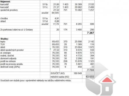 Nabízíme k pronájmu kancelář (2 místnosti + recepce + sklad) o celkové výměře 54,82 m2, obec Brno - Černovice, ul. U Svitavy. Kancelář se nachází v 6.NP / 6.NP administrativní budovy s výtahem. V kanceláři je položený nový zátěžový koberec. Areál je hlídán ostrahou 24h denně, k dispozici kantýna, recepce, služby ostatních firem v areálu. Možnost zapojení internetu a telefonu - není zahrnuto ve službách. Umístění sídla společnosti je možné. Na patře se nachází společná kuchyňka, k dispozici společná sprcha. V ceně je zahrnuto 2 parkovací stání u areálu, možnost pronájmu i více aut. Ihned k dispozici, pro více informací nás kontaktujte.