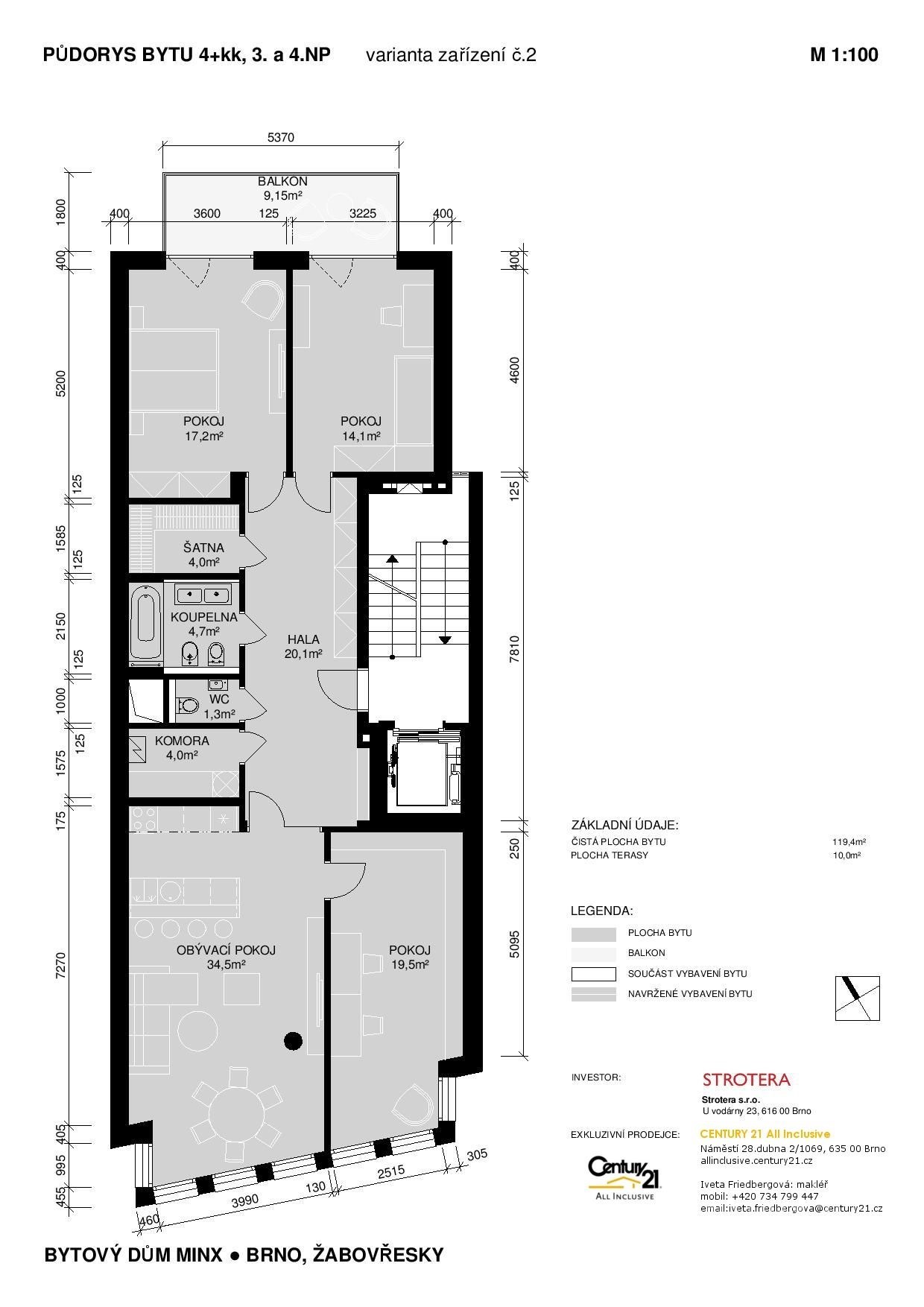 Prostor, světlo, komfort, krásný výhled z celého bytu, moderní architektura? Vše v jednom v Žabovřeskách. Jedinečná příležitost pronájmu bytu v Brně v Žabovřeskách o dispozici 4+KK a celkové ploše 129 m2. Prostorný, světlý byt o vnitřní podlahové ploše 120m2 s balkonem 9 m2 je orientován do klidného vnitrobloku do zahrad, nabízí uživatelům výhled na vzrostlé stromy. Parkování přímo v domě v zakladačích. Společným jmenovatelem celého bytového domu je mimořádné soukromí a velkorysý obytný prostor (na každém patře je pouze jeden byt), komfort (bezbariérový přístup výtahem až do bytu, parkování v domě) a světlo (dřevěná francouzská okna se skleněným zábradlím, speciální akustické ventilační mřížky do ulice). Špičkové standardy vybavení interiéru domu a bytu travertinový obklad vstupní haly, dřevěné dubové podlahy, dýhované dveře, s nerezovými klikami, koupelna s dvojumyvadlem a bidetem, podlahové topení s vlastním kotlem. Lokalita bytového domu je v oblíbené a vyhledávané čtvrti Brna „staré Žabovřesky“, nedaleko od centra města. V těsné blízkosti se nachází například Wilsonův les a sportovní areál Rosnička, ale také jedna z nejlepších základních škol města – ZŠ Sirotkova a elitní Gymnázium Matyáše Lercha. Autor projektu, prof. Ing. arch. Petr Pelčák, klade nebývalý důraz na kvalitní provedení a architekturu nejen domu jako celku, ale i řešením detailů interiérů. Cena podnájmu je 40.000, za byt, 2.000, za parkování. K ceně nájemného budou připočteny zálohy na služby ve výši 6.000, korun. Pro sjednání prohlídky Vašeho nového bydlení bez kompromisů kontaktujte makléřku. Volné ihned.
