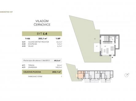 Ambienten VIP si Vám dovoluje nabídnout ve výhradním zastoupení majitele prodej bytové jednotky o dispozici 1+kk s terasou, zahradou a venkovním parkovacím stáním v nově postaveném luxusním viladomě na Faměrově náměstí v městské části Brno – Černovice. Bytová jednotka se nachází v 1. nadzemním podlaží a její podlahová plocha činí 49,50 m². S terasou o velikosti 8,6 m² a zahradou o rozloze 145,0 m² se celková užitná plocha rozšiřuje na 203,1 m². Byt nabízí praktické zádveří, koupelnu a hlavní obytný prostor s kuchyňským koutem. Z obytného prostoru je přímý vstup na terasu, která navazuje na soukromou zahradu. Venkovní parkovací stání je součástí uzavřeného areálu před viladomem a je zabezpečeno dálkově ovládanou závorou. Vytápění a ohřev teplé vody je řešen společným tepelným čerpadlem vzduch–voda, které slouží celému bytovému domu o osmi jednotkách. Okna jsou plastová s izolačním trojsklem, s přípravou na venkovní žaluzie a zapuštěnými garnýžemi. Vstupní dveře jsou bezpečnostní a protipožární, interiérové dveře bezfalcové a vybavené magnetickým zámkem. Koupelna je vybavena moderním walk-in sprchovým koutem, keramickou dlažbou a obklady, závěsným WC a přípravou na pračku a sušičku. Podlahy v obytných místnostech jsou vinylové, v koupelně a na toaletě keramická dlažba. Bezpečnostní systém bytu zajišťuje instalace Jablotronu, a vstup do objektu kontroluje centrální videotelefon s kamerou. Parkování je zajištěno vlastním venkovním stáním v uzavřeném areálu s dálkově ovládanou závorou. Spoluvlastnický podíl na zahradě o rozloze přibližně 1000 m² nabízí příjemné místo k odpočinku i zábavě, včetně dětských herních prvků. Pro internetové připojení a televizi je v bytě připravena kompletní datová infrastruktura. Celý dům je moderní cihlová novostavba. Městská část Brno – Černovice nabízí kompletní občanskou vybavenost – základní i mateřské školy, obchody, kavárny, restaurace, poštu, lékárnu, zdravotní středisko i sportoviště v pěší dostupnosti. Okolí nabízí mnoho možností k aktivnímu trávení volného času – Černovický hájek, nové parky, cyklostezky či dětská hřiště. Dopravní dostupnost je výborná, zastávka MHD je pár kroků od domu, centrum Brna autem za 7 minut a s dobrým napojením na dálnice D1 a D2. Hledáte-li byt v soukromí s výbornou dostupností, tak je tento byt určený právě pro Vás. V případě zájmu o více informací či termín prohlídky, neváhejte nás kontaktovat!