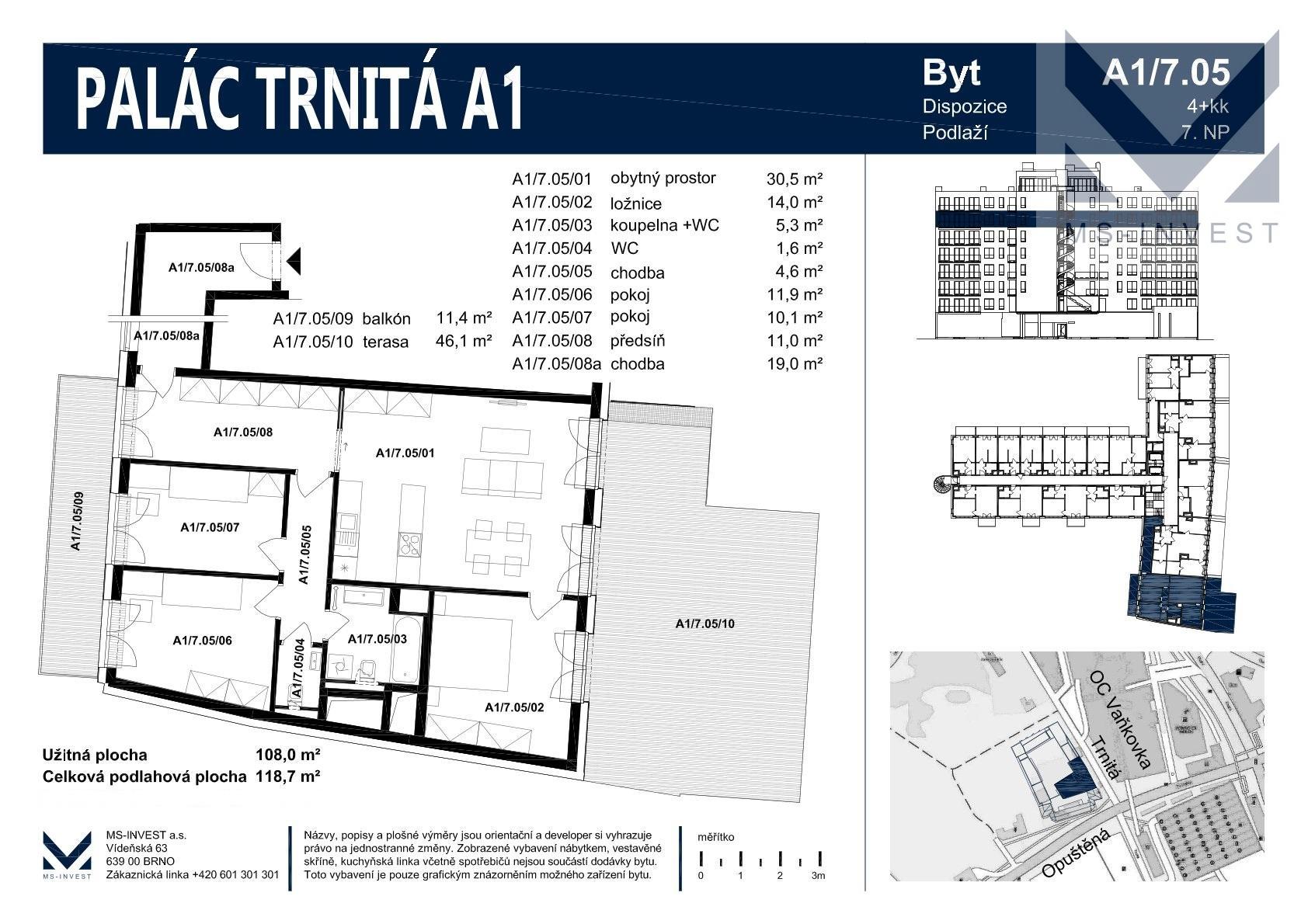 Nabízíme prodej novostavby bytu o dispozici 4+kk v 7. NP s velkorysou terasou a výhledem v nově vybudovaném developerském projektu Palác Trnitá, který najdete v hlavní rozvojové zóně města Brna, v těsném sousedství historického centra města Brna a NC Vaňkovka. Součástí bytu je vstupní chodba s možností umístění vestavěných skříní a vstupem na balkon orientovaný do vnitrobloku, obývací pokoj s kuchyňským koutem a vstupem na terasu, ložnice se vstupem na terasu, dva pokoje se vstupem na balkon, koupena, WC a sklep. K dokoupení garážové stání ve 2. PP domu. Ihned k nastěhování, domluvte si prohlídku.