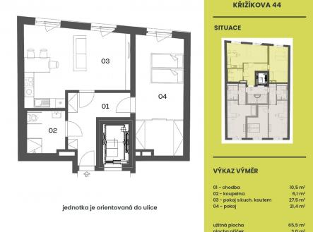Ve výhradním zastoupení investora nabízíme k prodeji novostavbu ubytovací jednotky (apartmán) s dispozicí 2+kk. Prostorný a nadstandardně vybavený apartmán je vhodný pro trvalé bydlení nebo jako ideální příležitost ke koupi investiční nemovitosti. Možnost financování pomocí hypotečního úvěru. O projektu: Moderní, urbanistické, avšak praktické, tak by se dal popsat projekt Křižíkova 44, jenž navrhl architekt Martin Bukolský. Dominantou je určitě jeho velká prosklená plocha domu, což příjemně a útulně prozáří celý apartmán slunečným svitem. Projekt má především spojovat aspekty moderního bydlení jdoucí spolu ruku v ruce se vzhledem starší tradiční zástavby typickou pro brněnskou předměstskou část Královo pole. Jedná se o celkem pětipodlažní budovu, přičemž na každém patře se nachází 3 plně vybavené apartmánové jednotky a ke každé z nich náleží i sklepní kóje. Nesporným bonusem je privátní parkování ve vnitrobloku, kdy k jednotce je přiděleno parkovací stání za povinný příplatek. Lokalita: Jak už název projektu napovídá, apartmány se nachází na ulici Křižíkova, tj. v brněnské předměstské části Královo Pole (lidově přechylovaná jako Krpole). Tato čtvrť je známá svou příjemnou atmosférou a nabízí tak klidnější životní styl oproti rušným centrálním městským částem. Dispozice apartmánu: chodba (10,5 m²), obývací pokoj s kuchyňským koutem (27,5 m²), pokoj (21,4 m²), koupelna s WC (6,1 m²), sklep