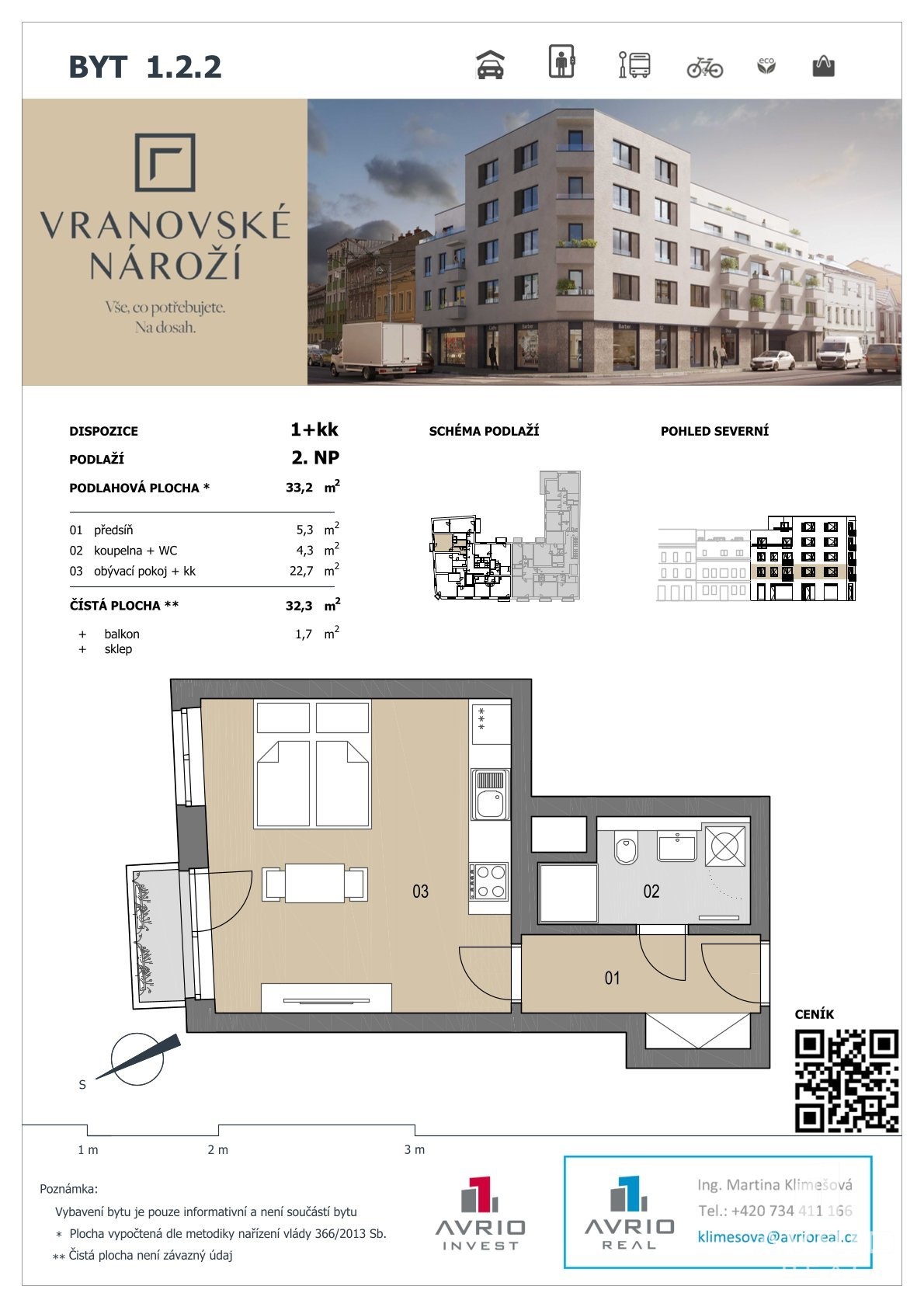 Představujeme Vám byt o dispozici 1+kk a výměře 32,3 m2 v projektu Vranovské nároží. Byt se nachází v 2. NP bytového domu s výtahem. K příslušenství patří sklepní kóje o výměře 3,5 m2. Perfektní dopravní dostupnost do centra, ale i na městský okruh přes dokončené Tomkovo náměstí činí lokalitu s rostoucím potenciálem. Byt je tak vhodný nejen pro vlastní bydlení, ale i na pronájem. Možnost přikoupit k bytu garážové stání pro pohodlné parkování. Dokončení stavby začátkem roku 2027. Husovice jsou městskou částí Brna, která se nachází severovýchodně od historického centra města, v údolí řeky Svitavy. Zastávka tramvaje č. 4 je doslova pár kroků od domu a snadné napojení na městský okruh zaručuje vynikající dopravní dostupnost autem i MHD. Mateřská škola, základní škola a gymnázium v pěší vzdálenosti. V blízkosti se nacházejí také supermarkety několika řetězců, restaurace i zařízení zdravotní péče. Podél řeky Svitavy se táhne oblíbená cyklostezka Brno-Adamov - ideální pro sport i procházky.