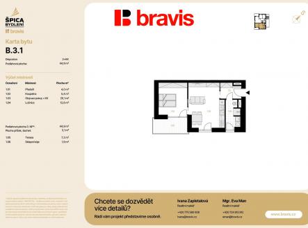 Moderní 2+kk v klidné brněnské lokalitě a v rezidenčním projektu pro náročné Nabízíme exkluzivní bytovou jednotku 2+kk (bytová jednotka B.3-1) v novém projektu Špica bydlení — byt umístěný ve 3. NP nízkoenergetického bytového domu B, kde je pouze 5 bytových jednotek. Celková podlahová plocha činí 44,7 m², navíc k ní náleží terasa 7,3 m², sklep a vlastní parkovací stání, což zajišťuje maximální komfort bez nutnosti dalších investic. Výhodou projektu je výhodné financování: 10 % při podpisu smlouvy a 90 % až po kolaudaci. Ideální řešení pro klienty, kteří chtějí bezpečně financovat nákup nové nemovitosti s minimální okamžitou zátěží. Dispozice a standard bytu Bytová jednotka B-3-1 (2+kk) Podlaží: 3. NP, nízkoenergetický dům . - Obývací pokoj 20,3 m2 s přípravou na kuchyňský kout. - Terasa 7,3 m2. - Ložnice 12,8 m2. - Koupelna + WC 5,2 m2. - Předsíň 4 m2. - Sklepní kóje v ceně. Nový vlastník si bude moci vybrat dekor podlah, obkladů a dveří z připravených vzorníků a propracovat si interiér podle vlastního vkusu ještě před dokončením stavby. Při rezervaci bytu do konce února 2026 je navíc součástí ceny venkovní parkovací stání a sklepní kóje — praktická řešení, která ocení klienti s nároky na pohodlí a jednoduchost. Špica bydlení — proč právě tento projekt Jde o exkluzivní developerský projekt situovaný v klidné brněnské městské části. Nabízí jedinečnou kombinaci moderní architektury, funkčních dispozic a vysokého standardu provedení. V rámci projektu vzniká celkem 49 jednotek/nemovitostí různých typů — 25 bytů v nízkopodlažních bytových domech, 9 rodinných domů a 15 bytů ve viladomech. Projekt je navržen s ohledem na nízkoenergetickou efektivitu, úsporný provoz nových domácností, dlouhodobou udržitelnost a kvalitní materiálové provedení. Špica bydlení je zároveň atraktivní volbou pro investory, kteří hledají perspektivní novostavbu v dobře dostupné lokalitě s potenciálem dlouhodobého zhodnocení. Stabilní poptávka po nájemním bydlení v této části Brna a dobrá dopravní dostupnost činí z projektu výbornou příležitost pro bezpečnou a dlouhodobou investici. Klienti-investoři navíc mohou využít odborné služby BRAVIS a bezplatné nacenění tržního nájemného pro daný byt i i kompletní správu nemovitosti, která zahrnuje vyhledání prověřených nájemníků, smluvní zajištění, inkaso plateb i pravidelné vyúčtování. Díky tomu se investice stává bezstarostnou a maximálně efektivní. Lokalita Brno-Tuřany — klidné bydlení s výhodami města Městská čtvrť Brno‑Tuřany je situována na jihovýchodním okraji Brna. Nabízí klidné bydlení s veškerou občanskou vybaveností: školy, školky, obchody, restaurace, služby a sportoviště — ideální pro život rodiny i jednotlivce. Zároveň Tuřany poskytují pohodlné spojení s centrem města a snadnou dostupnost, což ocení lidé, kteří chtějí spojit klid lokality se zelení a s komfortem městského života.