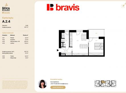 Moderní 2+kk v klidné brněnské lokalitě a v rezidenčním projektu pro náročné Nabízíme exkluzivní bytovou jednotku 2+kk (bytová jednotka A2-4) v novém projektu Špica bydlení — byt umístěný ve 2. NP nízkoenergetického bytového domu A. Celková podlahová plocha činí 44,7 m², navíc k ní náleží terasa 6,4 m², sklep a vlastní parkovací stání, což zajišťuje maximální komfort bez nutnosti dalších investic. Výhodou projektu je výhodné financování: 10 % při podpisu smlouvy a 90 % až po kolaudaci. Ideální řešení pro klienty, kteří chtějí bezpečně financovat nákup nové nemovitosti s minimální okamžitou zátěží. Dispozice a standard bytu Bytová jednotka A2-4 (2+kk) Podlaží: 2. NP, nízkoenergetický dům . Užitná plocha: 53,8 m2. - Obývací pokoj 20,4 m2 s přípravou na kuchyňský kout. - Terasa 6,4 m2. - Ložnice 12,8 m2. - Koupelna + WC 5,3 m2. - Předsíň 4 m2. - Sklepní kóje 1,9 m2 v ceně. Nový vlastník si bude moci vybrat dekor podlah, obkladů a dveří z připravených vzorníků a propracovat si interiér podle vlastního vkusu ještě před dokončením stavby. Při rezervaci bytu do konce února 2026 je navíc součástí ceny venkovní parkovací stání a sklepní kóje — praktická řešení, která ocení klienti s nároky na pohodlí a jednoduchost. Špica bydlení — proč právě tento projekt Jde o exkluzivní developerský projekt situovaný v klidné brněnské městské části. Nabízí jedinečnou kombinaci moderní architektury, funkčních dispozic a vysokého standardu provedení. V rámci projektu vzniká celkem 49 jednotek/nemovitostí různých typů — 25 bytů v nízkopodlažních bytových domech, 9 rodinných domů a 15 bytů ve viladomech. Projekt je navržen s ohledem na nízkoenergetickou efektivitu, úsporný provoz nových domácností, dlouhodobou udržitelnost a kvalitní materiálové provedení. Špica bydlení je zároveň atraktivní volbou pro investory, kteří hledají perspektivní novostavbu v dobře dostupné lokalitě s potenciálem dlouhodobého zhodnocení. Stabilní poptávka po nájemním bydlení v této části Brna a dobrá dopravní dostupnost činí z projektu výbornou příležitost pro bezpečnou a dlouhodobou investici. Klienti-investoři navíc mohou využít odborné služby BRAVIS a bezplatné nacenění tržního nájemného pro daný byt i i kompletní správu nemovitosti, která zahrnuje vyhledání prověřených nájemníků, smluvní zajištění, inkaso plateb i pravidelné vyúčtování. Díky tomu se investice stává bezstarostnou a maximálně efektivní. Lokalita Brno-Tuřany — klidné bydlení s výhodami města Městská čtvrť Brno‑Tuřany je situována na jihovýchodním okraji Brna. Nabízí klidné bydlení s veškerou občanskou vybaveností: školy, školky, obchody, restaurace, služby a sportoviště — ideální pro život rodiny i jednotlivce. Zároveň Tuřany poskytují pohodlné spojení s centrem města a snadnou dostupnost, což ocení lidé, kteří chtějí spojit klid lokality se zelení a s komfortem městského života.