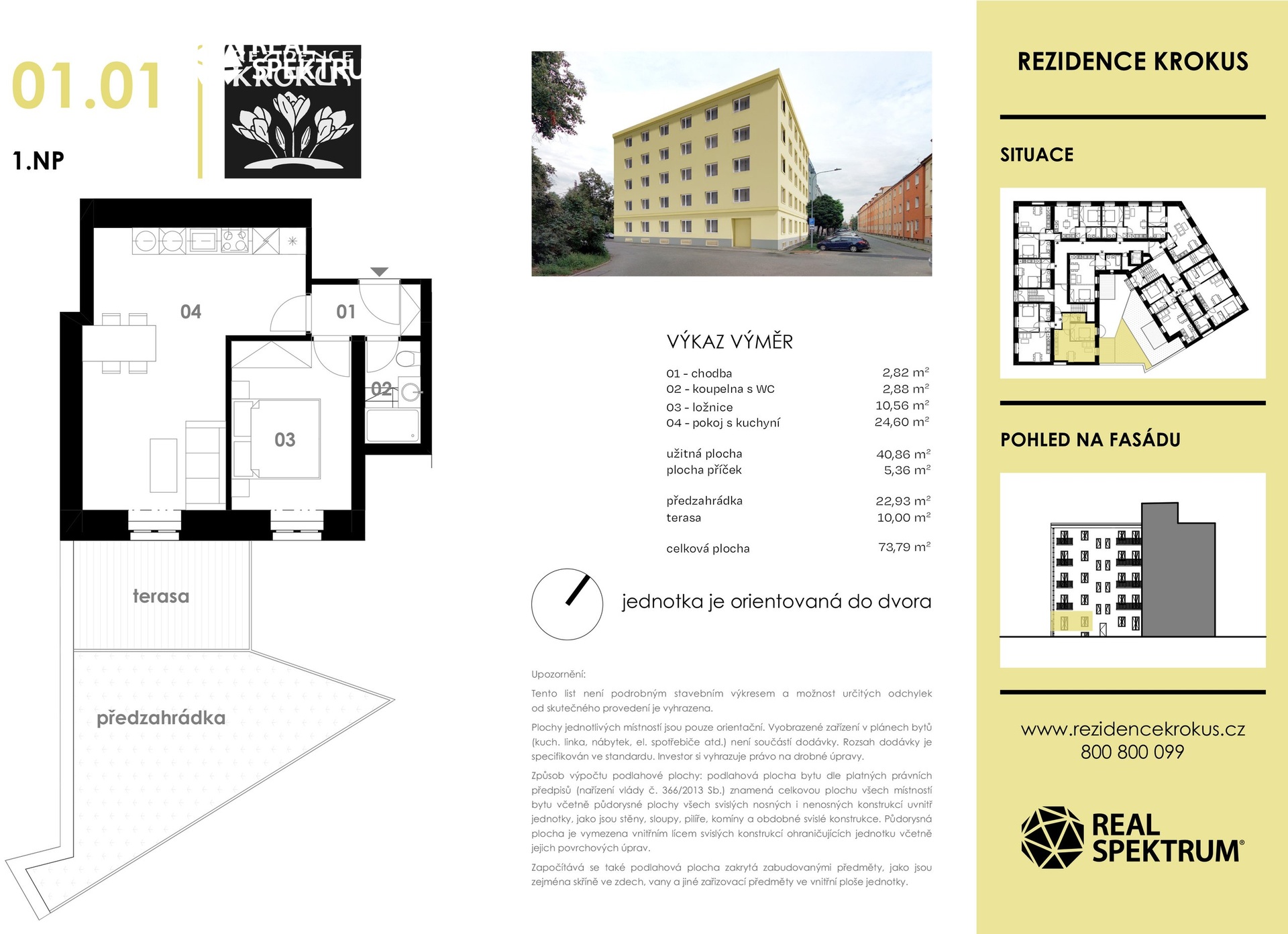 Nabízíme byt 2+kk v novém rezidenčním projektu Rezidence Krokus, situovaném v klidné a zavedené lokalitě městské části Brno-Židenice. Bytový dům je navržen s důrazem na praktické dispoziční řešení, dostatek denního světla a energetickou úspornost – spadá do energetické třídy A. Byt je vhodný jak pro vlastní bydlení, tak jako investiční příležitost k pronájmu. V okolí se nachází kompletní občanská vybavenost včetně obchodů, služeb, škol i zastávek MHD. Lokalita zajišťuje rychlé spojení do centra Brna i napojení na dálnice D1 a D2. V případě zájmu o bližší informace nebo prohlídku nás neváhejte kontaktovat. Dispozice bytu: vstupní chodba (2,8 m2), obývací pokoj s kuchyňským koutem (24,6 m2), pokoj (10,6 m2), koupelna s WC (2,9 m2), terasa (10,0 m2), zahrádka (22,9 m2)