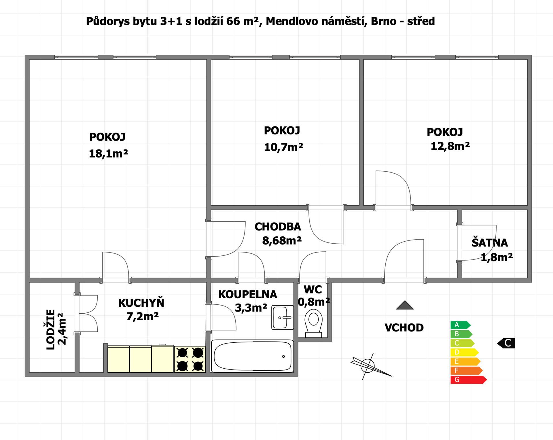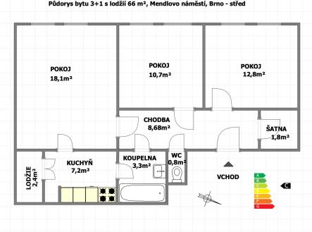 Prodej bytu 3+1 s lodžií 66 m², Mendlovo náměstí, Brno - střed