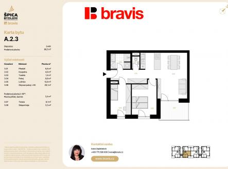 Modern 3+kk v klidné brněnské lokalitě a v rezidenčním projektu pro náročné Nabízíme exkluzivní bytovou jednotku 3+kk (bytová jednotka A2-3) v novém projektu Špica bydlení — byt umístěný ve 2. NP nízkoenergetického bytového domu A. Celková podlahová plocha činí 66,5 m2 s balkonem 9,3 m2, sklepem 3,3 m2 a vlastní parkovací stání, to vše v ceně bytu. Výhodou projektu je výhodné financování: 10 % při podpisu smlouvy a 90 % až po kolaudaci. Ideální řešení pro klienty, kteří chtějí bezpečně financovat nákup nové nemovitosti s minimální okamžitou zátěží. Dispozice a standard bytu Bytová jednotka A2-3 (3+kk) Podlaží: 2. NP, nízkoenergetický dům . Užitná plocha: 79,1 m2. - Obývací pokoj 28,1 m2 s přípravou na kuchyňský kout. - Balkon 8,1 m2. - Ložnice 12,6 m2. - Pokoj 9,8 m2. - Koupelna 4,6 m2. - Toaleta 1,4 m2. - Předsíň 6,6 m2. - Sklepní kóje 3,3 m2 v ceně. Parkovacího stání venkovní v ceně bytu. Nový vlastník si bude moci vybrat dekor podlah, obkladů a dveří z připravených vzorníků a propracovat si interiér podle vlastního vkusu ještě před dokončením stavby. Při rezervaci bytu do konce února 2026 je navíc součástí ceny venkovní parkovací stání a sklepní kóje — praktická řešení, která ocení klienti s nároky na pohodlí a jednoduchost. Špica bydlení — proč právě tento projekt. Jde o exkluzivní developerský projekt situovaný v klidné brněnské městské části. Nabízí jedinečnou kombinaci moderní architektury, funkčních dispozic a vysokého standardu provedení. V rámci projektu vzniká celkem 49 jednotek/nemovitostí různých typů — 25 bytů v nízkopodlažních bytových domech, 9 rodinných domů a 15 bytů ve viladomech. Projekt je navržen s ohledem na nízkoenergetickou efektivitu, úsporný provoz nových domácností, dlouhodobou udržitelnost a kvalitní materiálové provedení. Špica bydlení je zároveň atraktivní volbou pro investory, kteří hledají perspektivní novostavbu v dobře dostupné lokalitě s potenciálem dlouhodobého zhodnocení. Stabilní poptávka po nájemním bydlení v této části Brna a dobrá dopravní dostupnost činí z projektu výbornou příležitost pro bezpečnou a dlouhodobou investici. Klienti-investoři navíc mohou využít odborné služby BRAVIS a bezplatné nacenění tržního nájemného pro daný byt i i kompletní správu nemovitosti, která zahrnuje vyhledání prověřených nájemníků, smluvní zajištění, inkaso plateb i pravidelné vyúčtování. Díky tomu se investice stává bezstarostnou a maximálně efektivní. Lokalita Brno-Tuřany — klidné bydlení s výhodami města Městská čtvrť Brno‑Tuřany je situována na jihovýchodním okraji Brna. Nabízí klidné bydlení s veškerou občanskou vybaveností: školy, školky, obchody, restaurace, služby a sportoviště — ideální pro život rodiny i jednotlivce. Zároveň Tuřany poskytují pohodlné spojení s centrem města a snadnou dostupnost, což ocení lidé, kteří chtějí spojit klid lokality se zelení a s komfortem městského života.