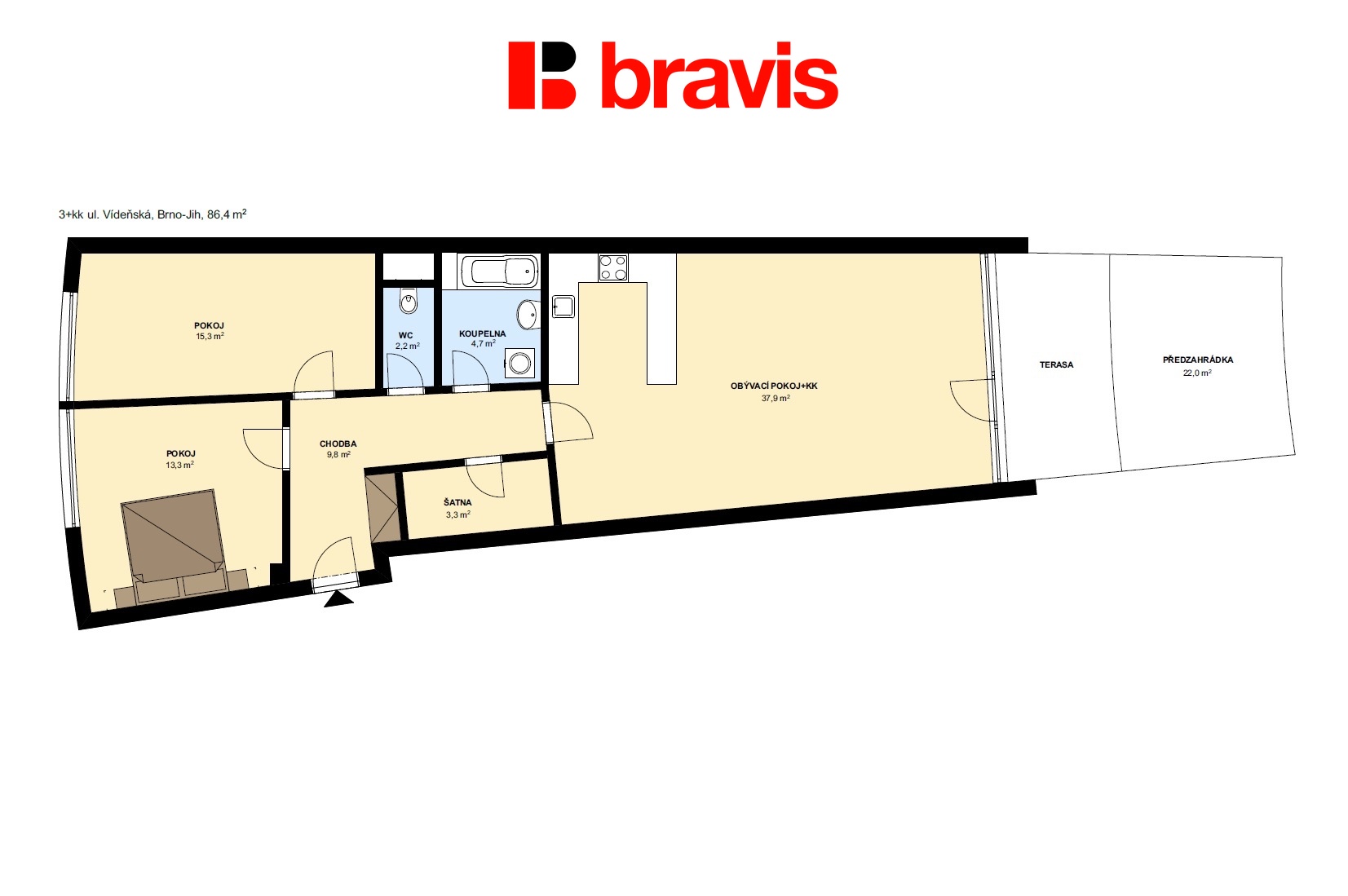 Ve výhradním zastoupení majitele nabízíme k prodeji prostorný byt o dispozici 3+kk v atraktivní lokalitě Brno – Štýřice, na ulici Vídeňská. Byt o podlahové ploše 86 m² se nachází ve 2. nadzemním podlaží moderního bytového domu s výtahem. Velkou výhodou je předzahrádka s terasou o celkové výměře 22 m², která je orientována do klidného vnitrobloku a nabízí příjemné soukromí i prostor pro odpočinek. Součástí prodeje je také garážové stání a sklepní kóje o velikosti 2 m² - vše již zahrnuto v ceně. Dispozičně je byt velmi dobře řešen. Kuchyňská část je vybavena moderní kuchyňskou linkou se všemi vestavěnými spotřebiči – lednicí s mrazicím boxem, indukční varnou deskou, troubou, mikrovlnnou troubou, myčkou a digestoří. Na kuchyň navazuje prostorný obývací pokoj, ze kterého je přímý vstup na terasu a předzahrádku orientovanou do vnitrobloku. Druhý pokoj je ponechán bez vybavení a lze jej využít jako ložnici, dětský pokoj nebo pracovnu. Třetí pokoj je vybaven vestavnou šatní skříní. Koupelna disponuje prostorným sprchovým koutem, umyvadlem se skříňkou a přípojkou na pračku. Toaleta je samostatná. V chodbě se nachází věšáková stěna se skříňkami a samostatná šatna s vestavěnými úložnými prostory. Lokalita Brno – Štýřice patří mezi velmi vyhledávané městské části díky své výborné dostupnosti do centra i kompletní občanské vybavenosti. V docházkové vzdálenosti se nachází zastávky MHD, obchody, restaurace, kavárny, lékárna, pošta, nemocnice i základní škola. Velkou předností lokality je také nově vybudovaná náplavka v bezprostřední blízkosti domu, která nabízí ideální prostor pro volnočasové aktivity. Ať už si chcete jít zaběhat, projet se na kole, projít se podél řeky nebo si jen posedět a užít si klidné prostředí, právě zde najdete příjemné místo pro relax i aktivní odpočinek. Náplavka se postupně stává vyhledávaným místem pro trávení volného času a výrazně zvyšuje atraktivitu celé lokality. V případě zájmu o prohlídku či více informací neváhejte kontaktovat uvedeného makléře. Kompletní právní, hypoteční a daňový servis je samozřejmostí.