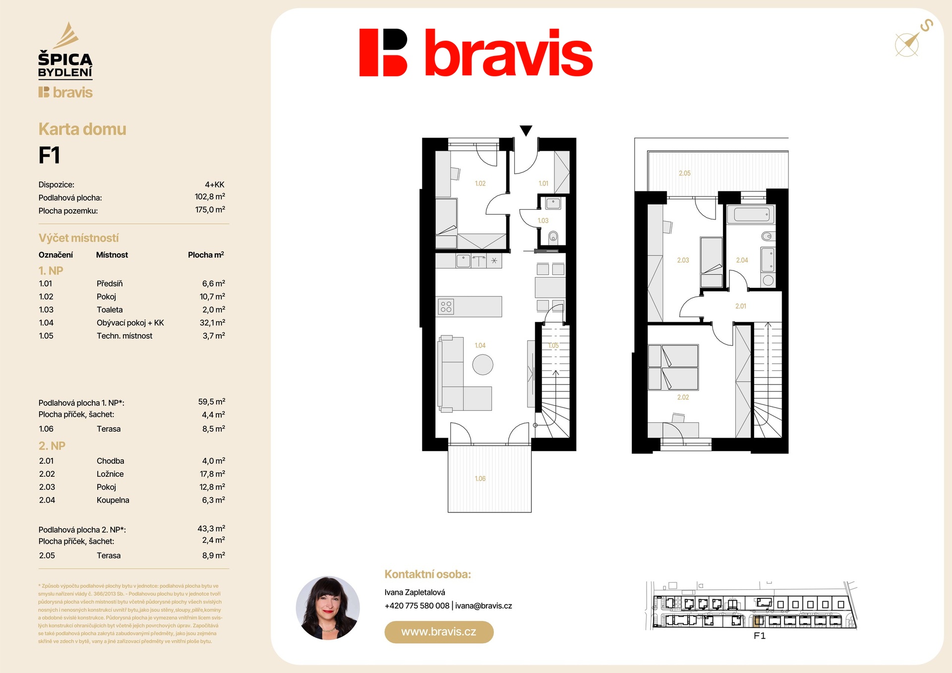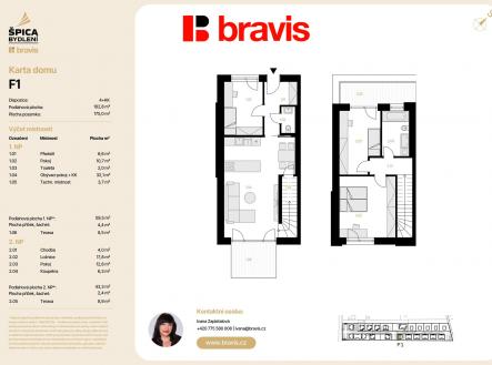 Moderní dvojdům 4+kk v klidné brněnské lokalitě a v rezidenčním projektu pro náročné Nabízíme exkluzivní rodinný dům označený F1-1 o dispozici 4+kk, zahrada 56,3 m2 ,terasa 17,4 m2, v novém projektu Špica bydlení. Dům o celkové výměře 102,8 m2 na pozemku 175 m2. Dům 4+kk - F1-1. Užitná plocha: 102,8 m2. 1.NP - Obývací pokoj 32,1 m2 s přípravou na kuchyňský kout. - Ložnice 10,7 m2. - Pokoj 10,4 m2. - Toaleta 2 m2. - Techn.místnost 3,7 m2. - Terasa 8,5 m2. 2.NP: - Chodba 4 m2. - Ložnice 17,8 m2. - Pokoj 12,8 m2. - Koupelna 6,3 m2. - Terasa 8,9 m2 - Celková plocha pozemku 175 m2. K domu navíc náleží venkovní parkovací stání. Výhodou projektu je výhodné financování: 10 % při podpisu smlouvy a 90 % až po kolaudaci. Ideální řešení pro klienty, kteří chtějí bezpečně financovat nákup nové nemovitosti s minimální okamžitou zátěží. Nový vlastník si bude moci vybrat dekor podlah, obkladů a dveří z připravených vzorníků a propracovat si interiér podle vlastního vkusu ještě před dokončením stavby. Špica bydlení — proč právě tento projekt. Jde o exkluzivní developerský projekt situovaný v klidné brněnské městské části. Nabízí jedinečnou kombinaci moderní architektury, funkčních dispozic a vysokého standardu provedení. V rámci projektu vzniká celkem 49 jednotek/nemovitostí různých typů — 25 bytů v nízkopodlažních bytových domech, 9 rodinných domů a 15 bytů ve viladomech. Projekt je navržen s ohledem na nízkoenergetickou efektivitu, úsporný provoz nových domácností, dlouhodobou udržitelnost a kvalitní materiálové provedení. Špica bydlení je zároveň atraktivní volbou pro investory, kteří hledají perspektivní novostavbu v dobře dostupné lokalitě s potenciálem dlouhodobého zhodnocení. Stabilní poptávka po nájemním bydlení v této části Brna a dobrá dopravní dostupnost činí z projektu výbornou příležitost pro bezpečnou a dlouhodobou investici. Klienti-investoři navíc mohou využít odborné služby BRAVIS a bezplatné nacenění tržního nájemného pro daný byt i i kompletní správu nemovitosti, která zahrnuje vyhledání prověřených nájemníků, smluvní zajištění, inkaso plateb i pravidelné vyúčtování. Díky tomu se investice stává bezstarostnou a maximálně efektivní. Lokalita Brno-Tuřany — klidné bydlení s výhodami města Městská čtvrť Brno‑Tuřany je situována na jihovýchodním okraji Brna. Nabízí klidné bydlení s veškerou občanskou vybaveností: školy, školky, obchody, restaurace, služby a sportoviště — ideální pro život rodiny i jednotlivce. Pro více informací kontaktujte níže uvedeného makléře
