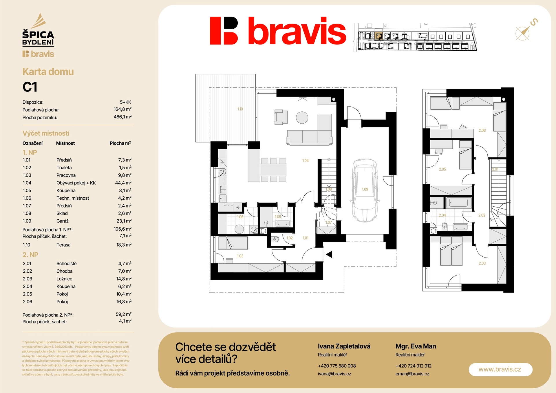 Moderní dům 5+kk v klidné brněnské lokalitě a v rezidenčním projektu pro náročné Nabízíme exkluzivní rodinný dům označený C1 o dispozici 5+kk, zahrada 279,8 m, garáž 23,3 m2, plocha zpevněná 65,8 m2, v novém projektu Špica bydlení. Dům o celkové výměře 164,8 m2 na pozemku 486,1 m2, plocha pozemku bez domu 362,7 m2. Dům C1(5+kk) Podlaží: přízemí, nízkoenergetický dům . Užitná plocha: 164,8 m2. - Obývací pokoj 45 m2 s přípravou na kuchyňský kout. - Garáž 23,3 m2. - Terasa 2x 7,3 a 8 m2. - Ložnice 14,7 m2. - Pokoj 10,4 m2. - Pokoj 16,8 m2. - Pracovna 9,8 m2. - Koupelna 3,1 a 6,2 m2. - Toaleta 1,4 m2. - Předsíň 7,8 a 2,5 m2. - Technická místnost 4,2 m2. - Sklad 2,9 m2. - Terasa 18,3 m2. - Zahrada 279,8 m2. - Celková plocha pozemku 486,1 m2. K domu navíc náleží venkovní parkovací stání. Výhodou projektu je výhodné financování: 10 % při podpisu smlouvy a 90 % až po kolaudaci. Ideální řešení pro klienty, kteří chtějí bezpečně financovat nákup nové nemovitosti s minimální okamžitou zátěží. Nový vlastník si bude moci vybrat dekor podlah, obkladů a dveří z připravených vzorníků a propracovat si interiér podle vlastního vkusu ještě před dokončením stavby. Špica bydlení — proč právě tento projekt. Jde o exkluzivní developerský projekt situovaný v klidné brněnské městské části. Nabízí jedinečnou kombinaci moderní architektury, funkčních dispozic a vysokého standardu provedení. V rámci projektu vzniká celkem 49 jednotek/nemovitostí různých typů — 25 bytů v nízkopodlažních bytových domech, 9 rodinných domů a 15 bytů ve viladomech. Projekt je navržen s ohledem na nízkoenergetickou efektivitu, úsporný provoz nových domácností, dlouhodobou udržitelnost a kvalitní materiálové provedení. Špica bydlení je zároveň atraktivní volbou pro investory, kteří hledají perspektivní novostavbu v dobře dostupné lokalitě s potenciálem dlouhodobého zhodnocení. Stabilní poptávka po nájemním bydlení v této části Brna a dobrá dopravní dostupnost činí z projektu výbornou příležitost pro bezpečnou a dlouhodobou investici. Klienti-investoři navíc mohou využít odborné služby BRAVIS a bezplatné nacenění tržního nájemného pro daný byt i i kompletní správu nemovitosti, která zahrnuje vyhledání prověřených nájemníků, smluvní zajištění, inkaso plateb i pravidelné vyúčtování. Díky tomu se investice stává bezstarostnou a maximálně efektivní. Lokalita Brno-Tuřany — klidné bydlení s výhodami města Městská čtvrť Brno‑Tuřany je situována na jihovýchodním okraji Brna. Nabízí klidné bydlení s veškerou občanskou vybaveností: školy, školky, obchody, restaurace, služby a sportoviště — ideální pro život rodiny i jednotlivce. Pro více informací kontaktujte níže uvedeného makléře