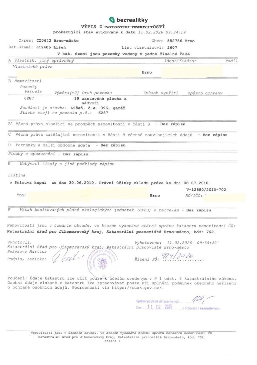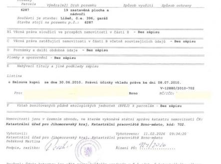 Nabízím k prodeji garáž v Brně - Líšni (PSČ 628 00) č. event. 396. Garáž se nachází v menším, samostatném, uzamykatelném, areálu v prostoru ulic Zikova a Podruhova. Garáž je ve velmi dobrém technickém stavu – udržovaná, suchá, nikde nezatéká, vhodná pro parkování nebo jako skladový prostor. Konstrukčně je řešena jako betonová prefabrikovaná stavba s betonovými základy. Podlaha je betonová. Odvětrávání je zajištěno větracími otvory v zadní stěně a ve vratech. Vrata garáže jsou plechová, vyztužená, dvoukřídlá, střecha garáže plochá. Garáž je dobře zabezpečená. V garáži je elektřina 230 V a 400 V, vlastní měřič. Bez nutností oprav. Výměra garáže 19 m2. Užitná plocha cca. 16,5 m2 (hloubka: 5,30 m, šíře 3,12 m, výška 1,98 m). Garáž je v osobním vlastnictví, včetně (vlastního) pozemku – a to na rozdíl od drtivé většiny garáží v dané lokalitě. Garáž není zatížena žádnými právními omezeními – viz přiložený výpis z KN. Množina garáží v Brně-Líšni je konečná, další výstavbu nových garáží nelze predikovat. Přístupová cesta ke garáži (před garáží) je ve vlastnictví Statutárního města Brna (roční nájem cca. 150 Kč). Klidná lokalita. Garáž je vyklizená. Provoz garáže neobtěžuje hlukem ani emisemi okolní obyvatelé. Garáž je dobře dostupná z revitalizovaného sídliště Brno-Líšeň, případně MHD. Tato nemovitost je určena výhradně přímým zájemcům o koupi. Na inzerát můžete také reagovat přímo na webu Bezrealitky.