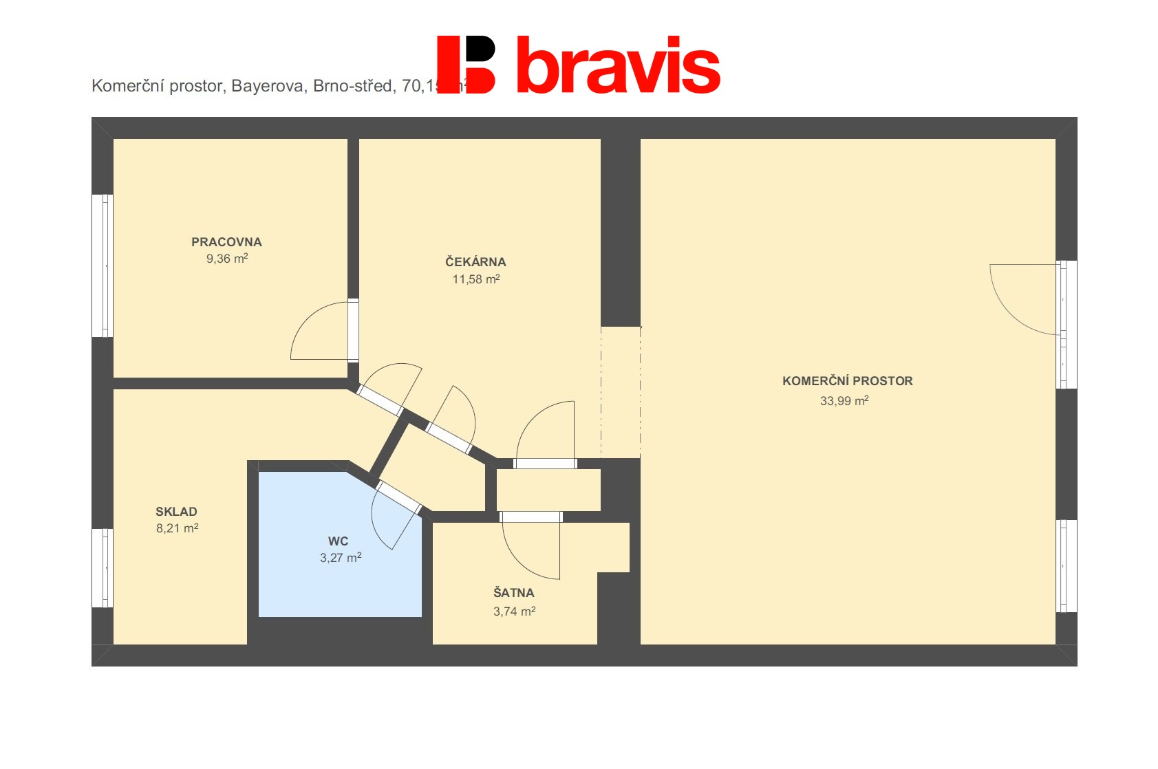 Ve výhradním zastoupení vám nabízíme k prodeji komerční prostory o rozloze 70 m² v atraktivní části Brno-Veveří. Tyto prostory jsou ideální pro kadeřnictví, kosmetické služby, masáže, nehtové studio nebo jiné podnikatelské aktivity. Součástí ceny nemovitosti je i jedno parkovací stání přímo před prostorem. Prostory se nacházejí v přízemí budovy a budou připraveny k vašemu využití zcela prázdné. Je zde možnost připojení k internetu, což zajistí, že budete vždy ve spojení se svými klienty. Okna jsou plastová s dvojitým zasklením, což přispívá k úspoře energie. Dům je zateplený s izolací o tloušťce 14 cm z polystyrenu. Prostor je vybaven vlastním plynovým kotlem, které vám umožní regulovat teplotu podle vašich potřeb. Samozřejmostí jsou také samostatné měřiče na vodu, plyn a elektřinu, což vám poskytne plnou kontrolu nad spotřebou. Bayerova ulice je jednou z nejvyhledávanějších lokalit v Brně. Nacházíte se v těsné blízkosti centra města, což znamená, že máte vše na dosah ruky – v domě se nachází restaurace, a jen cca 5 minut chůze je park Lužánky, obchody, restaurace, kavárny, školy i kulturní vyžití. Dopravní dostupnost je vynikající, ať už preferujete MHD, nebo vlastní automobil. Tato nemovitost představuje skvělou investiční příležitost díky své poloze a modernímu vybavení. Pokud hledáte prostor, který splní všechny potřeby vašeho podnikání, srdečně vás zveme k osobní prohlídce. S financováním vám rádi poradíme a poskytneme všechny potřebné informace. Pro více informací neváhejte kontaktovat uvedeného makléře.