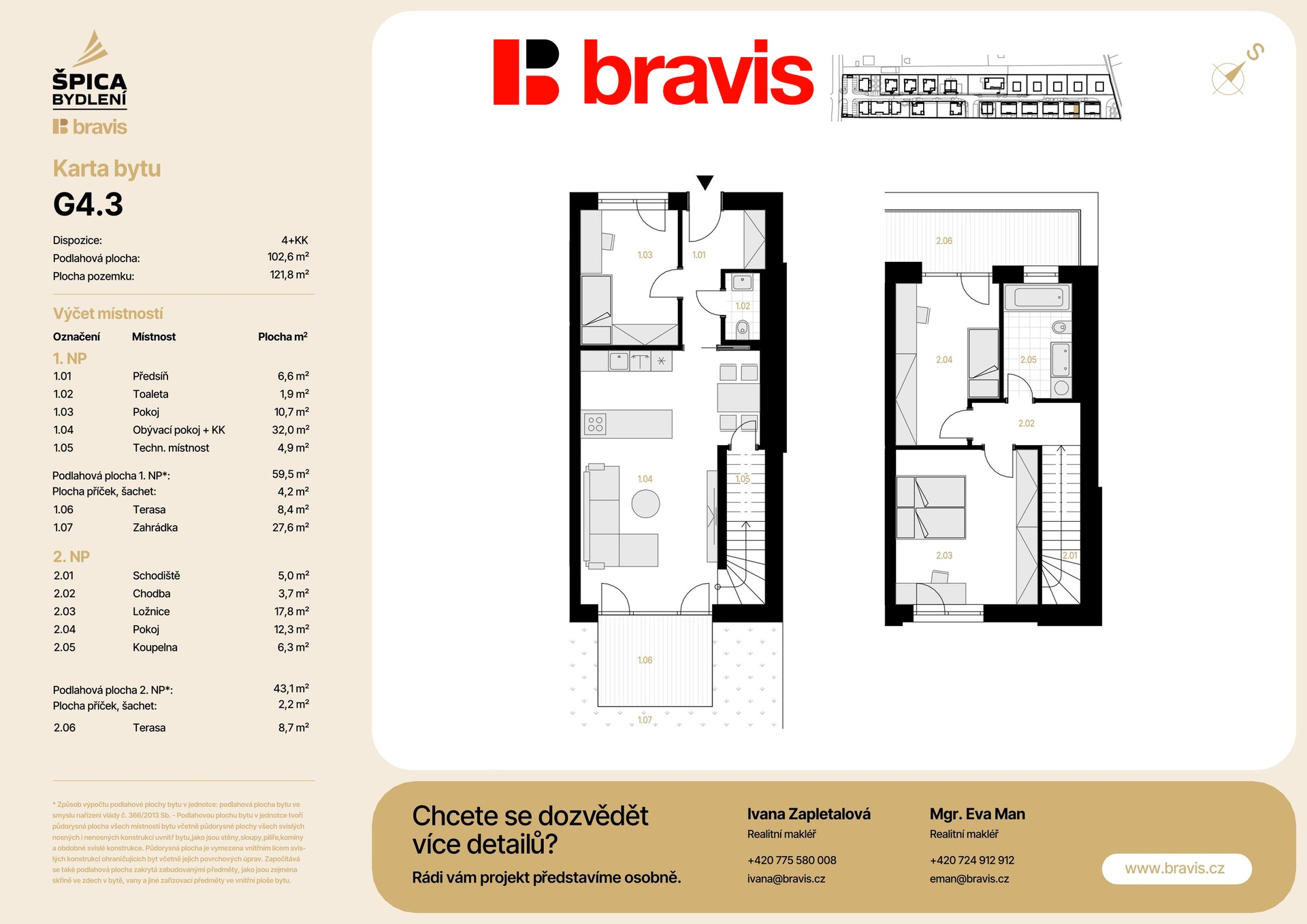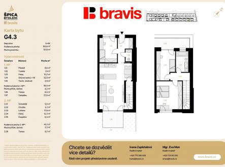 Hledáte kombinaci komforního a zárověň kvalitního bydlení, v klidné lokalitě s výbornou dostupností do centra Brna? Přesně takové je bydlení v novém, prestižním developerském projektu Špica bydlení v brněnských Tuřanech – ideální volbu pro páry či rodinné bydlení s výhodnou investicí do budoucna. Tato výjimečná bytová jednotka o dispozici 4+KK (G.4.3) je umístěna ve viladomě G 5, kde jsou celkově pouze 3 bytové jednotky. Celková podlahová plocha bytu je 102,6 m². K bytu náleží dvě terasy: 8,4 m² a 8,7 m² a zahrádka s výměrou 27,6 m². Výhodou projektu je výhodné financování: 10 % při podpisu smlouvy a 90 % až po kolaudaci. Ideální řešení pro klienty, kteří chtějí bezpečně financovat nákup nové nemovitosti s minimální okamžitou zátěží. Navíc projekt nabízí bonusy při rezervaci do konce února 2026: pokud se rozhodnete rychle, získáte zcela zdarma: • Venkovní parkovací stání – žádné starosti s hledáním místa k parkování • Sklepní kóji – praktické řešení pro uložení sezónních věcí Vyberte si Váš byt dříve, než to udělá někdo jiný! Parametry bytu G.4.3, nacházejíího se ve viladomě G, o dispozici 4+KK, které Vás nadchnou: 1. NP: • Prostorný obývací pokoj: 32 m² s přípravou na kuchyňský kout – světlý a vzdušný prostor • Pokoj: 10,7 m² - pracovna nebo pokoj pro hosty • Sklad: 4,9 m² - může sloužit jako šatna či na úschovu sezonních věcí • Technická místnost: 4,9 m² • Samostatné WC: 1,9 m² - pro větší soukromí všech obyvatel bytu • Praktická předsíň: 6,6 m² – dostatek místa pro uložení všech věcí • Terasa: 8,4 m² – prostor pro ranní kávu nebo večerní relaxaci • Zahrádka: 27,6 - Váš vlastní venkovní prostor 2.NP: • Útulná ložnice: 17,8 m² – soukromý prostor pro odpočinek a relaxaci • Pokoj: 12,3 m², ideální jak pro malé tak velké děti • Moderní koupelna: 6,5 m² – vybavená kvalitními sanitárními prvky • Schodiště: 5 m², chodba: 3,7 m² • Terasa: 8,7 m² Proč si vybrat právě tento byt? ️ Nový developerský projekt s garancí kvality ️ Nízkoenergetický standard – šetříte od prvního dne ️ Kompletní vybavení v ceně – parkovací stání + sklep – pouze do konce února ️ Možnost individualizace – byt podle Vašich představ ️ Perspektivní lokalita s rostoucí hodnotou ️ Ideální dispozice 4+kk – funkční a dostatečně prostorná ️ Terasa – Váš osobní venkovní prostor Lokalita Tuřany – klid i dostupnost v jednom Brněnské Tuřany nabízejí ideální kombinaci klidného bydlení v zeleni s výbornou dostupností všech služeb: • Skvělé dopravní napojení – rychlé spojení do centra Brna i na dálnici • Kompletní občanská vybavenost – obchody, školy, školky, zdravotní zařízení v dosahu • Příjemné prostředí s dostatkem zeleně pro aktivní odpočinek Projekt Špica Tuřany je exkluzivním developerským projektem, který je situovaný v klidné brněnské městské části. Nabízí jedinečnou kombinaci moderní architektury, funkčních dispozic a vysokého standardu provedení. V rámci projektu vzniká celkem 49 jednotek/nemovitostí různých typů — 25 bytů v nízkopodlažních bytových domech, 5 rodinných domů, 2 dvojdomy a 15 bytů ve viladomech. Projekt je navržen s ohledem na nízkoenergetickou efektivitu, úsporný provoz nových domácností, dlouhodobou udržitelnost a kvalitní materiálové provedení. Pokud Vás tento projekt zaujal a rádi byste využili zvýhodněné nabídky, ozvěte se uvedné makléřce pro více informací.
