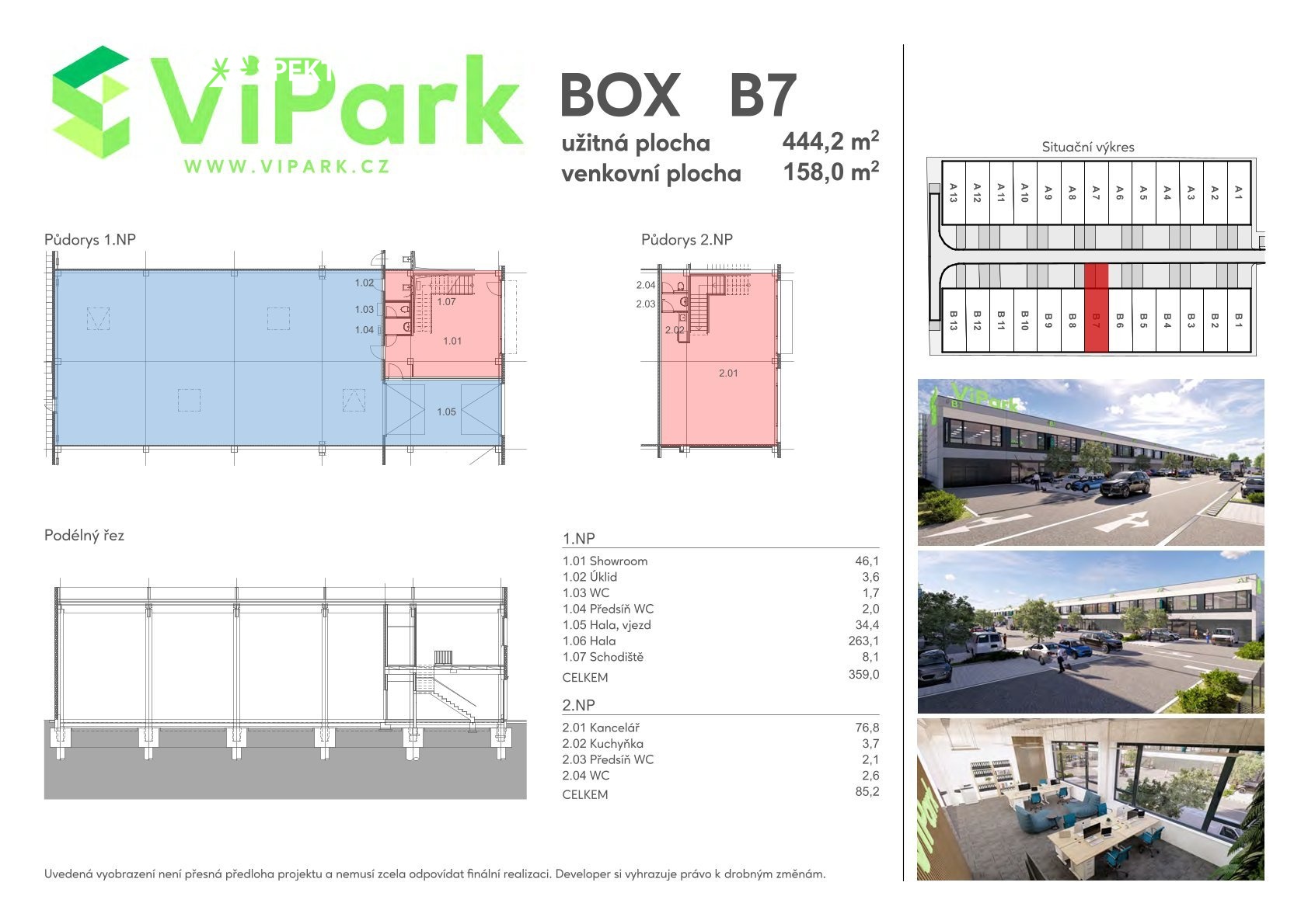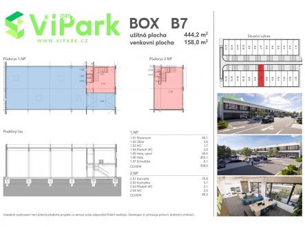 Ve výhradním zastoupení nabízíme prodej posledního podnikatelského boxu v novém komerčním areálu ViPark Brno. Ideální pro firmy hledající prostory pro obchodní činnost, skladování nebo drobnou výrobu. Strategické umístění nabízí rychlou dostupnost do centra a zároveň blízkost nájezdů na dálnice a rychlostní komunikace, MHD přímo před areálem. Bezproblémový příjezd kamionem samozřejmostí. Součástí je i vlastní venkovní plocha pro parkování a manipulaci. Celá stavba je navržena jako energeticky velmi úsporná. Kolaudace 6/2025. Více na stránkách vipark. užitná plocha boxu 444,2 m² (hala 297,5 m²; kancelář, showroom 122,9 m²; zázemí 23,8 m²) venkovní plocha 158 m² 7 parkovacích míst možnost rozšíření užitné plochy vestavbou v halové části. MODERNÍ KOMERČNÍ NOVOSTAVBA splňuje nejnovější standardy a přináší inovativní pracovní prostředí pro podnikání STRATEGICKÁ POLOHA vynikající dopravní dostupnost, ideální poloha s rychlým přístupem jak na dálniční spojení, tak do centra Brna, MHD přímo před areálem FLEXIBILITA komerční prostory pro obchodní aktivity, skladování, distribuci i drobnou výrobu VELMI ÚSPORNÁ STAVBA důraz na efektivitu a úspornost, což znamená nízké provozní náklady