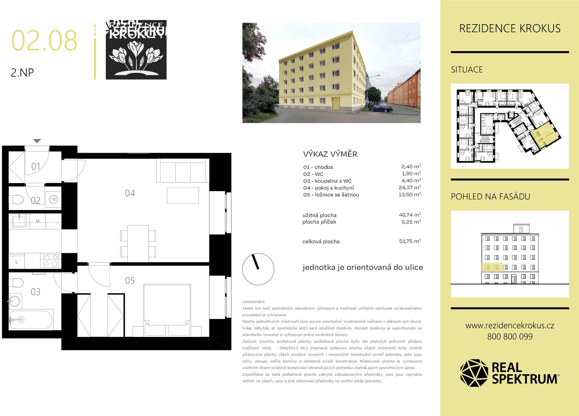 Nabízíme prostorný byt 2+kk v novém rezidenčním projektu Rezidence Krokus, situovaném v klidné a zavedené lokalitě městské části Brno-Židenice. Bytový dům je navržen s důrazem na praktické dispoziční řešení, dostatek denního světla a energetickou úspornost – spadá do energetické třídy A. Byt je vhodný jak pro vlastní bydlení, tak jako investiční příležitost k pronájmu. V okolí se nachází kompletní občanská vybavenost včetně obchodů, služeb, škol i zastávek MHD. Lokalita zajišťuje rychlé spojení do centra Brna i napojení na dálnice D1 a D2. V případě zájmu o bližší informace nebo prohlídku nás neváhejte kontaktovat. Dispozice bytu: vstupní chodba (2,4 m²), obývací pokoj s kuchyňským koutem (24,4 m²), pokoj (13,5 m²), pokoj (8,6 m²), koupelna (4,4 m²), WC (1,8 m²)
