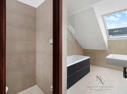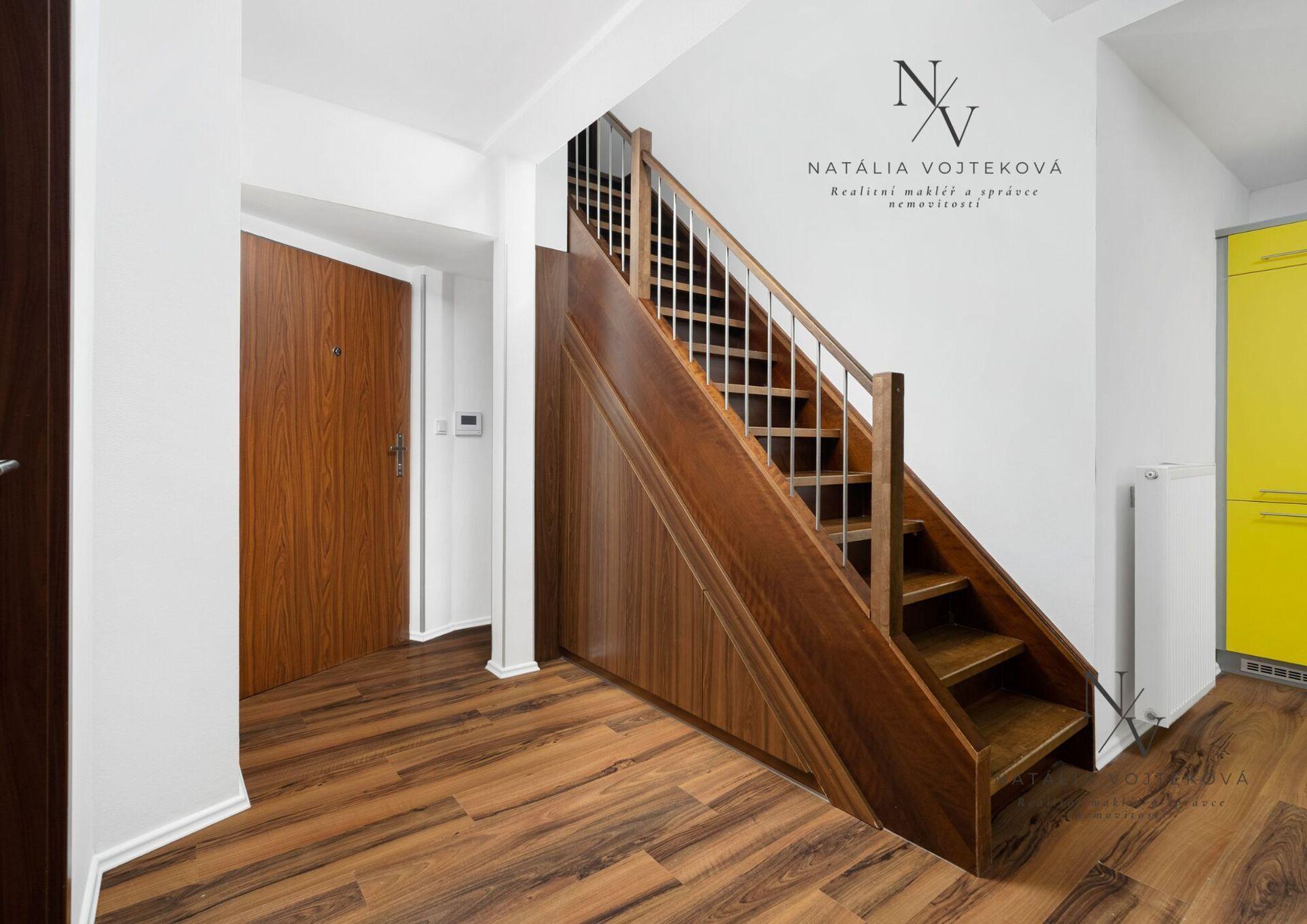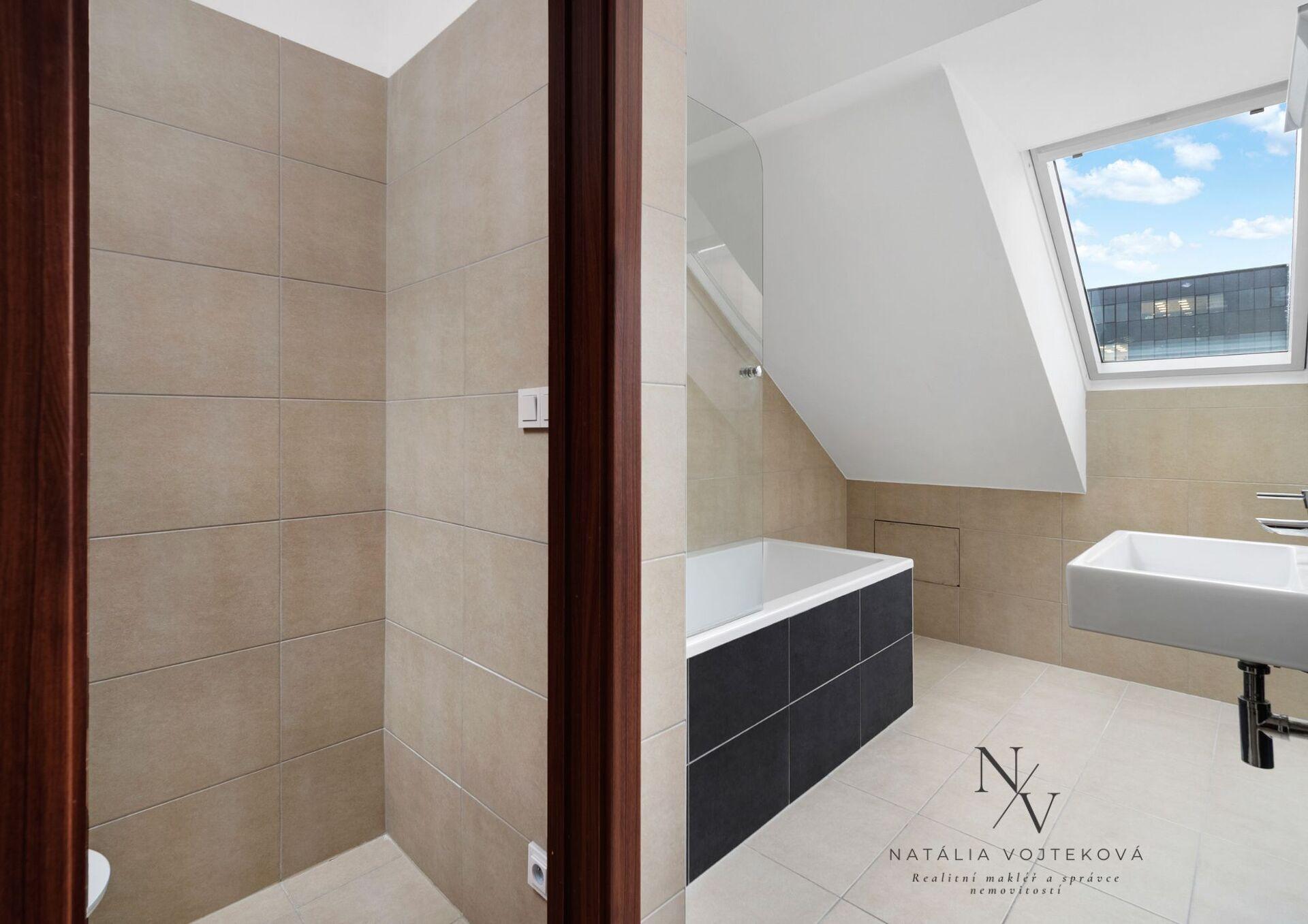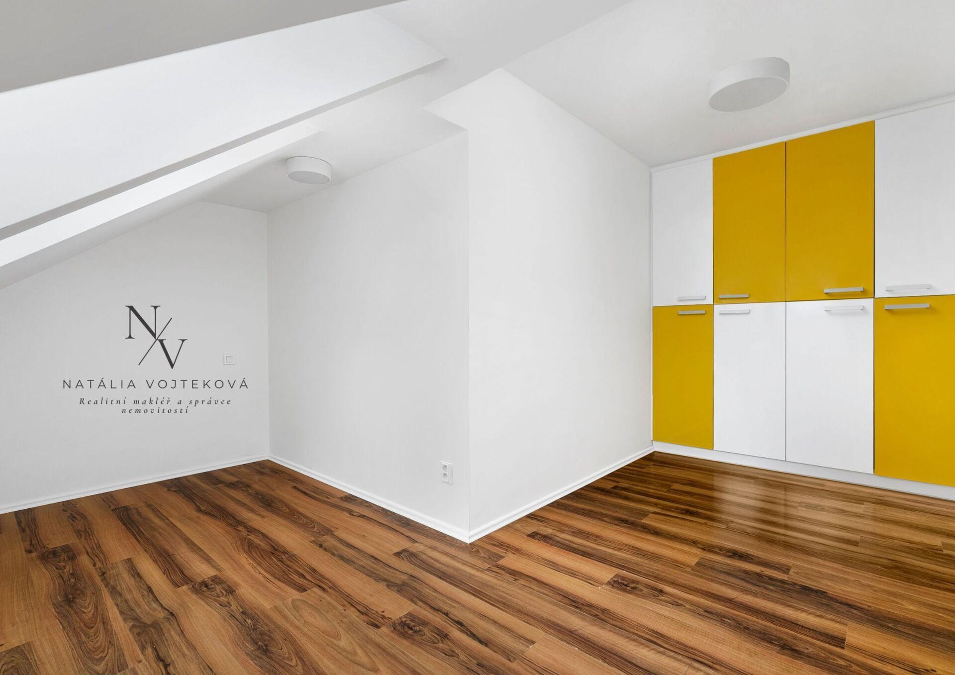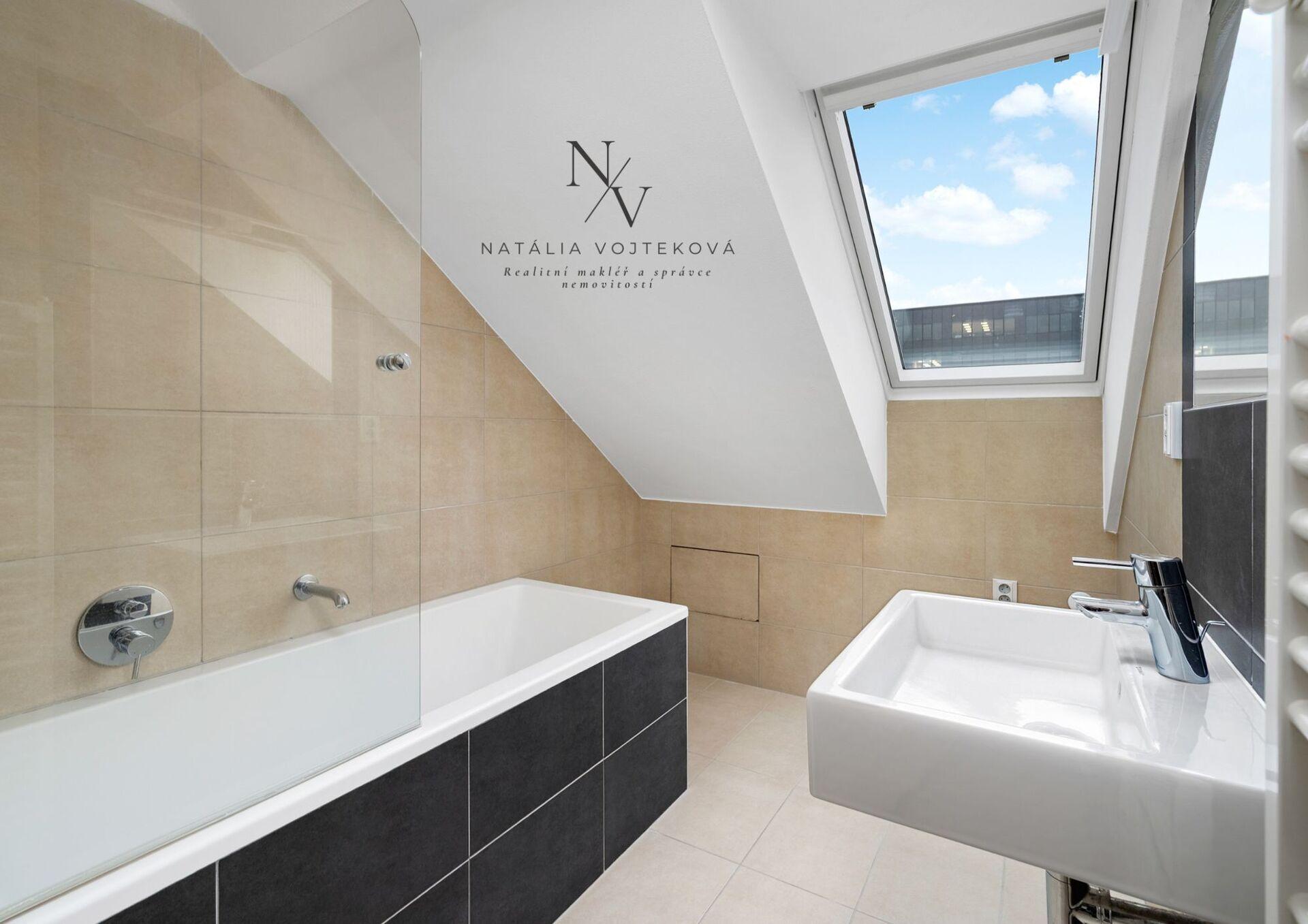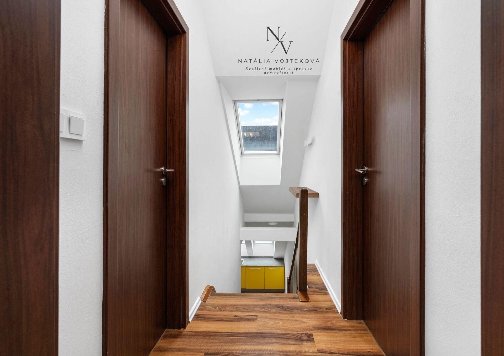 Představuji Vám ke koupi půdní mezonetovou vestavbu v osobním vlastnictví v městské části Ponava, na Chaloupeckého náměstí. Byt se nachází v 5. patře cihlového domu s výtahem, nabízí dispozici 3+1 s balkónem a užitnou plochou 83 m². Kolaudace 2010. Hlavní přednosti • Mezonetová dispozice – přirozené oddělení denní a klidové zóny • Balkón orientovaný na severovýchod – příjemné světlo po celý den a bez letního přehřívání, výhled na Brno • Maximální komfort – samostatné WC na každém podlaží • Vlastní vytápění elektrokotlem • Komora na patře – praktický úložný prostor navíc • Skvělá dostupnost MHD – zastávka Šumavská cca 3 min chůze • Internet v bytě k dispozici Dispozice Spodní podlaží: obývací pokoj propojený s kuchyní, vstupní chodba a samostatné WC. Horní podlaží: 2 samostatné pokoje (jeden se vstupem na balkón), koupelna s vanou a druhé WC. Vybavení Kompletně vybavená kuchyňská linka (myčka, lednice s mrazákem, varná deska, trouba, digestoř). V obou pokojích šatní skříně na míru. Plovoucí podlahy. Byt je ve velmi dobrém stavu a připraven k užívání. Dům V domě jsou nové rozvody elektřiny, stoupačky a vody a výtah po generální opravě. V suterénu je k dispozici společenská místnost se sportovním a hobby koutkem. Možnost přístupu na společný uzavřený dvůr domu. Výměry (dle půdorysu) • Zádveří: 7,1 m² • Kuchyně: 12,9 m² • Obývací pokoj: 15,7 m² • WC (spodní): 1,6 m² • Pokoj: 13,8 m² • Pokoj: 15,6 m² • Koupelna: 6,4 m² • WC (horní): 1,0 m² • Schodiště: 5,0 m² • Balkón: 3,6 m² • Komora (na patře): 0,6 m² • Užitná plocha celkem: 83 m² Měsíční náklady Měsíční náklady na bydlení činí cca 4 577,- Kč + elektřina dle spotřeby. Pro více informací nebo sjednání prohlídky mě prosím kontaktujte.
