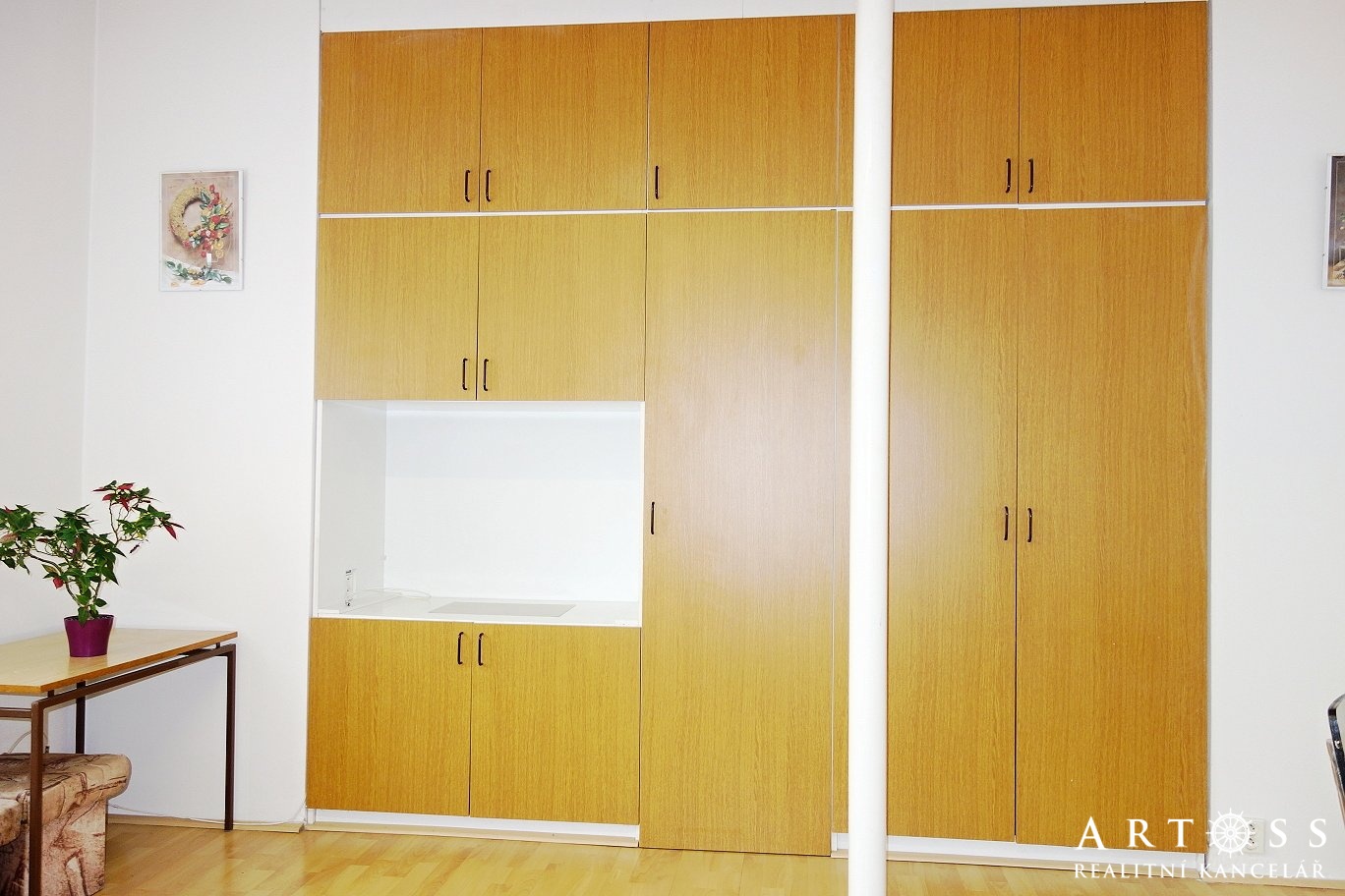 V zastoupení majitele nabízíme k pronájmu zařízený byt 1+kk. Jedná se o menší byt na 1.NP bytového domu. Vstupem do bytu se dostaneme do pokoje, ve který je vybaven válendou, stolem a židlemi, 2x malá komoda a úložnými prostory ve stěně. Možno i dodání TV. Kuchyně s kuchyňskou linkou, elektrickým vařičem a lednicí. Dále je zde koupelna se sprchovým koutem a WC a přípojkou na pračku. Byt má nová plastová okna. Byt je ideálně vhodný pro 1 osobu. Majitel preferuje zájemce s českým občanstvím, kteří jsou nekuřáci a nemají děti ani domácí mazlíčky nájemné 9.000,- + 4.500,- energie, voda a služby 13.500,- kauce. 13.500,- + DPH 21% provize Internet WIFI v ceně nájmu. Volné k nastěhování od: ihned