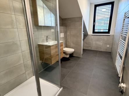 Nabízíme k pronájmu velmi pěknou novostavbu prostorného cihlového bytu 2+KK s vlastním parkovacím stáním u domu na ulici Mlaty, Brno, Bosonohy. Byt se nachází ve 2. NP/2 právě dokončené novostavby rodinného domu se dvěma bytovými jednotkami. Celková plocha bytu činí 60m2 + 5m2 vstupní chodba. Byt je částečně zařízený novou kuchyňskou linkou vč. elektrického sporáku, lednicí, jídelním stolem se židlemi a velkou šatní skříní v ložnici, jinak bez vybavení. Dispozice bytu: vstupní chodba/schodiště 5m2, ložnice 19m2, velký obývací pokoj 29m2 s kuchyňským koutem a nadstandardní světlou výškou, prostorná koupelna 9m2 se sprchovým koutem, WC, prostorem na pračku a sušičku, koupelna je s oknem. Vytápění bytu elektrickým podlahovým vytápěním (náklady na elektřinu odhadem 2.500,- Kč měsíčně), ohřev vody vlastním boilerem. Jedná se o velmi pěkné a zcela nové bydlení v klidné lokalitě (klidná skoro neprůjezdná ulice), snadná dostupnost do centra Brna, nedaleko Areál Campus a FN Brno Bohunice, v okolí domu pěkná příroda, ideální bydlení pro mladý pár. Nedaleko domu zastávka MHD a v okolí kompletní občanská vybavenost. Vlastní venkovní parkovací stání před domem v ceně nájmu, v ceně nájmu také wi-fi internet. Majitel požaduje vratnou kauci ve výši min. 35 tis. Kč + provize RK. Volné ihned.