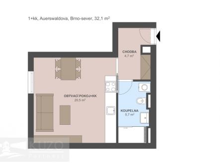 Pronájem bytu 1+kk, 32,1 m², 6. NP – novostavba, Auerswaldova, Brno-sever