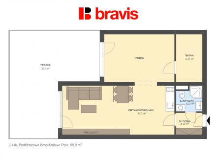 Ve výhradním zastoupení majitele nabízíme k pronájmu byt o dispozici 2+kk na ulici Poděbradova v Brně-Královo Pole. Byt (56m2) se nachází v 1. patře bytového domu s výtahem. Nabízí se jako částečně zařízený. K bytu náleží terasa 32 m2 a garážové stání. Kuchyňská část je vybavena vestavěnou kuchyňskou linkou s varnou deskou, el. troubou, mikrovl. troubou a digestoří. Kuchyňský kout je propojen s obývací částí, která je bez vybavení. Z obývací části je vstup na terasu, stejně tak i z ložnice. Ložnice je nezařízená. V koupelně je sprchový kout, umyvadlo se skříňkou, zrcadlo a přípojka na pračku a toaleta. Možnost internetového a TV připojení (O2). Veškerá občanská vybavenost v nejbližším okolí - restaurace, obchody, ZŠ, výborná dostupnost do centra města, OC Tesco. Zastávka MHD vzdálená od domu do pár minut. K dispozici 03/2026. Možnost zajištění jednorázového či pravidelného úklidu naší úklidovou firmou. Doporučujeme.