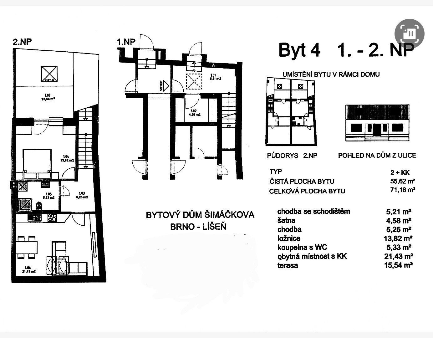 Nabízíme Vám k pronájmu útulný byt o dispozici 2+kk v lokalitě Brno – Líšeň, na ulici Šimáčkova. Tento byt má užitnou plochu 56 m2, nachází se v 1. a 2. N P. Celková plocha bytu zahrnuje obývací pokoj s kuchyňským koutem (21 m2), který je vybaven linkou se spotřebiči (elektrická trouba s indukční deskou, digestoř, mikrovlnná trouba, vestavná myčka), ložnici (14 m2) a koupelnu se sprchovým koutem s WC (5 m2), prostornou chodbu se schodištěm (5 m2), chodbu (5 m2) a šatnu (5 m2). K bytu náleží terasa (16 m2) a sklep. Možnost připojení k internetu. Nájemné/měsíc: 18 900 Kč + zálohy na služby 4 000 Kč (energie, voda, teplo). Vratná jistina: 20 000 Kč. Provize RK: 18 900 Kč. V okolí domu je veškerá občanská vybavenost, zastávka MHD v blízkosti. Byt je volný od února 2026.