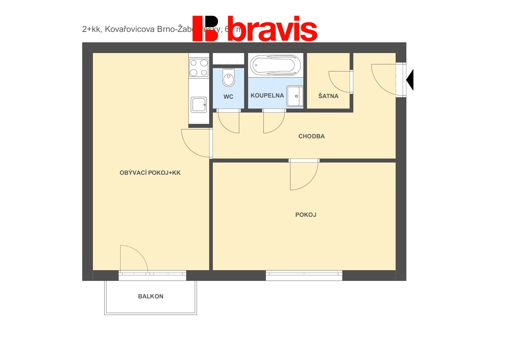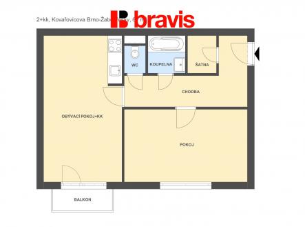 Pronájem bytu 2+kk v Brně - Žabovřeskách, ul. Kovařovicova, balkon, parkovací stání, komora, sklep