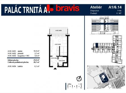 Pronájem kompletně zařízeného bytu 1+kk, Palác Trnitá, ul. Trnitá, s balkonem a možností garážového