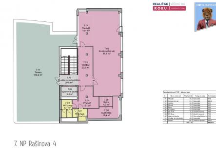 Jedinečná možnost pronájmu prostorné open-space kanceláře v posledním patře moderní budovy na ulici Rašínova s vlastní terasou s výhledem na celé centrum Brna! V rámci užitné plochy 140,9 m2 je k dispozici celé 7.NP, které novým nájemníkům nabízí velký open-space prostor o velikosti 96,5 m2 s plátnem na projektor (původně prostor sloužil jako velká konferenční místnost). V rámci zázemí kanceláře jsou pak k dispozici oddělené pánské a dámské toalety, prostorná kuchyňská se spotřebiči a malá místnost, která může sloužit např. jako šatna, navolávací místnost, apod.. Velký open-space je teoreticky možné příčkami rozdělit na menší prostory, pokud to uznáte za vhodné. Budova disponuje velkou terasou s výhledem na obě hlavní dominanty Brna - hrad Špilberk i katedrálu sv. Petra a Pavla. 1/3 terasy patří výhradně k tomuto kancelářskému prostoru a zbylé 2/3 jsou sdílené. Firemní večírky nebo obchodní setkání dostanou díky tomuto výhledu novou dimenzi. Stejné tak Vaši zaměstnanci ocení možnost odpočinku a čerstvého vzduchu s krásným výhledem na město. Unikátem je pak dále parkovací zakladač s kapacitou přes 30 míst, díky kterému si užijete komfortu parkování v centru, vč. vjezdu do pěší zóny. Než stihnete sejít dole ke garážím, už Vás bude čekat automobil nachystaný k výjezdu. Budova je po kompletní rekonstrukci a prostory mohou být pro Vás připraveny k nastěhování v rámci pár týdnů. Veškeré kanceláře jsou plně klimatizované a disponují velkými okny, díky kterým budete pracovat v příjemném prosvětleném prostředí. Každé patro disponuje vlastní kuchyňkou a toaletami, K dispozici jsou i skladové prostory v suterénu domu. Tyto jedinečné prostory jsou nabízeny za 64.111,- Kč/měsíc + poplatky. V případě zájmu o více informací čí prohlídku mě neváhejte kontaktovat.