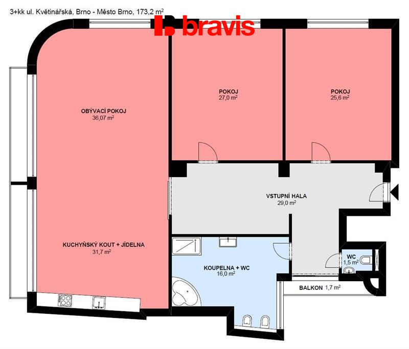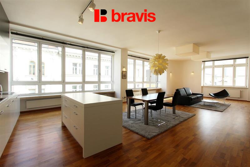 Ve výhradním zastoupení majitele nabízíme k pronájmu prostorný, luxusně zařízený byt 3+kk v srdci Brna na prestižní adrese, ulice Květinářská s klimatizací, balkónem a internetem v ceně. Byt (173,2 m2) se nachází v 5. patře cihlové budovy s výtahem. Nabízí se jako kompletně zařízený.. Vestavěná bílá kuchyně (31,7 m2) zahrnuje kombinovanou lednici, odsavač par, mikrovlnnou troubu, myčku nádobí, varnou desku a troubu, varnou konvici a veškeré nádobí. Dále je zde jídelní stůl se čtyřmi židlemi. Prosvětlená obytná část (36,07 m2) je zařízena obývací stěnou s TV, pohovkou, křeslem, konferenčním stolem a klimatizací. První ložnice (25,6 m2) je vybavena dvojpostelí s nočními stolky, komodami a klimatizací. Druhá ložnice (27 m2) je zařízena dvojpostelí, vestavěnými skříněmi v celé šíři pokoje a klimatizací. Velkorysá koupelna (16 m2) je vybavena rohovou vanou, sprchovým koutem, dvojumyvadlem, toaletou, bidetem, skříňkami, otopným žebříkem a pračkou. Druhá toaleta (1,5 m2) je samostatně s malým umyvadlem. Další úložný prostor je ve vestavěných skříních a komodě ve vstupní hale (29 m2). Z chodby se vchází také na balkón (1,7 m2). V bytě se nachází podlahové topení, dřevěné dveře, dřevěné podlahy v kombinaci s dlažbou a horizontální žaluzie. Internet a kabelová TV je již v ceně nájmu. Perfektní občanská vybavenost v těsné blízkosti domu - u Zelného trhu, restaurace, obchody, nákupní centrum Velký Špalíček, divadla, kino, zastávky MHD u domu, bankomaty, banky, lékárny, fitness ad. Prohlídky jsou možné kdykoliv po domluvě s uvedeným makléřem. Možnost zajištění jednorázového nebo pravidelného úklidu naší úklidovou firmou.
