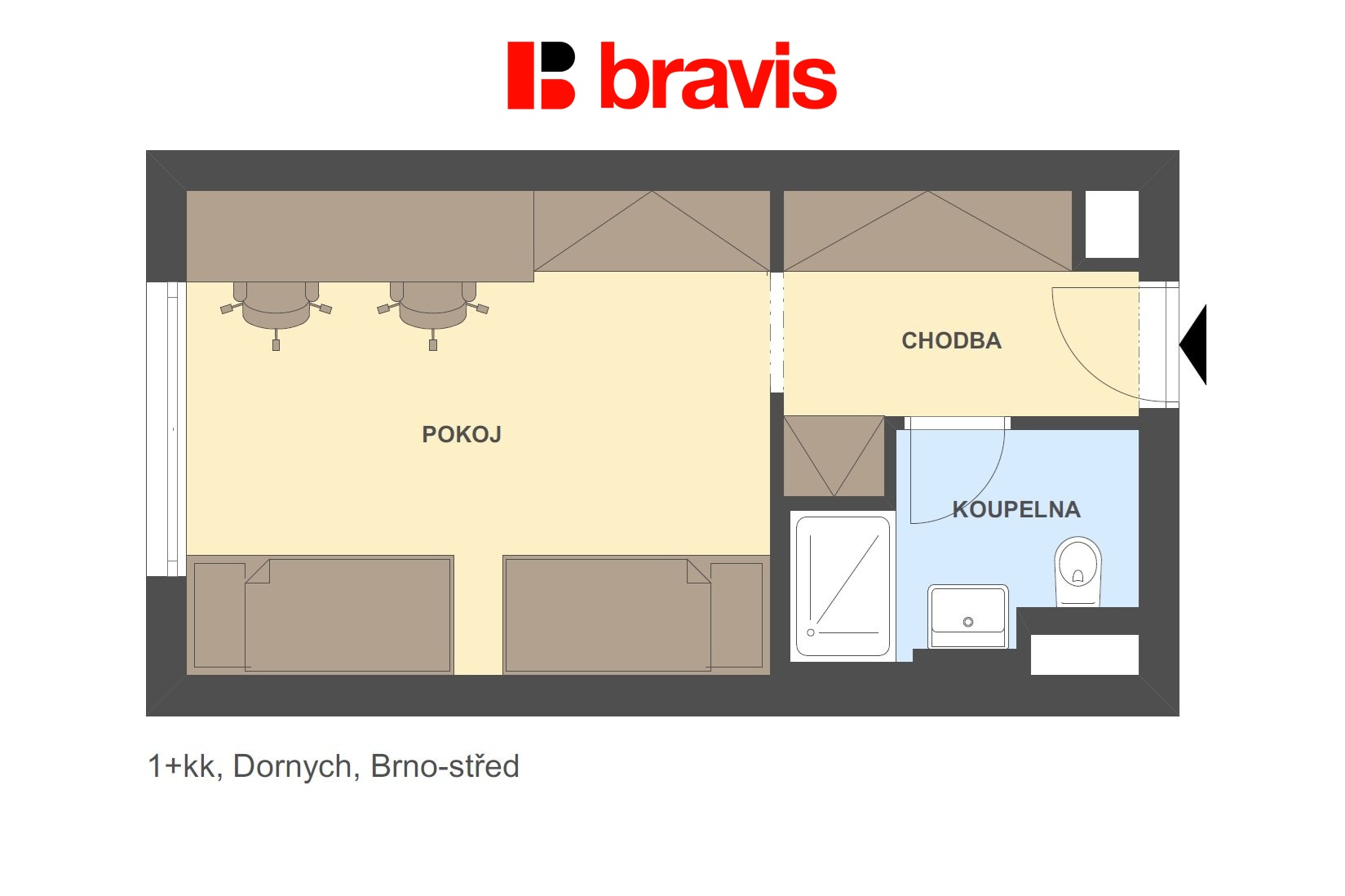 NEPLATÍTE PROVIZI Moderní, bezpečné, metropolitní bydlení na dosah centra Brna. Tím vším a mnohem více je jednotka o velikosti 1+kk v rezidenčním domě na ulici Dornych v Brně. Na výběr je z více dispozic a velikostí jednotek - nutno vidět a zažít atmosféru tohoto nadčasového bydlení. SPECIÁLNÍ NABÍDKA: POSILOVNA ZDARMA pro všechny rezervace na 12+měsíců s nastěhováním v únoru Výhody bydlení: • neplatíte provizi • moderní polyfunční novostavba • výborná lokalita • kompletně zařízené • základní wifi v ceně • možnost krátkodobého ubytování Rezidence nabízí mimo jiné využití: • recepce a bezpečnostní služba 24/7 • chillout zóna, reprezentativní prostory co-workingové prostory a studovna - vše pro práci i relax • velkorysé prostory pro společné vaření • společná terasa s výhledem • venkovní prostory s parkovou úpravou a ohništěm • kulečník • moderní posilovna přímo v domě • parkovací stání • kolárna, půjčovna kol zdarma • úklidové služba, prádelna • bezpečné, přátelské a moderně vybavené prostředí pro každého - místní komunita je opravdu multikulturní a otevřená. Vybavení: • 2 jednolůžka s úložným prostorem • 2 pracovní stoly se židlemi • vestavěná skříň • kuchyňská linka včetně malé ledničky a sklo-keramické varné desky • koupelna s WC Kompletně zařízená jednotka je skvělou volbou pro studenty, pracující, expaty nebo jako startovací bydlení. Rezidenční komplex se nachází v atraktivní lokalitě v centru města, která nabízí veškerou občanskou vybavenost doslova na dosah ruky - jen pár minut chůze od centra města, Vaňkovky, hlavního nádraží i autobusového uzlu Zvonařka. V blízkosti naleznete obchody, restaurace, kavárny, parky, cyklostezky, školy i zdravotnická zařízení. Lokalita také nabízí skvělé dopravní spojení, ať už preferujete MHD, jízdu na kole či vlastní automobil. Prohlídky možné po domluvě s uvedeným makléřem.