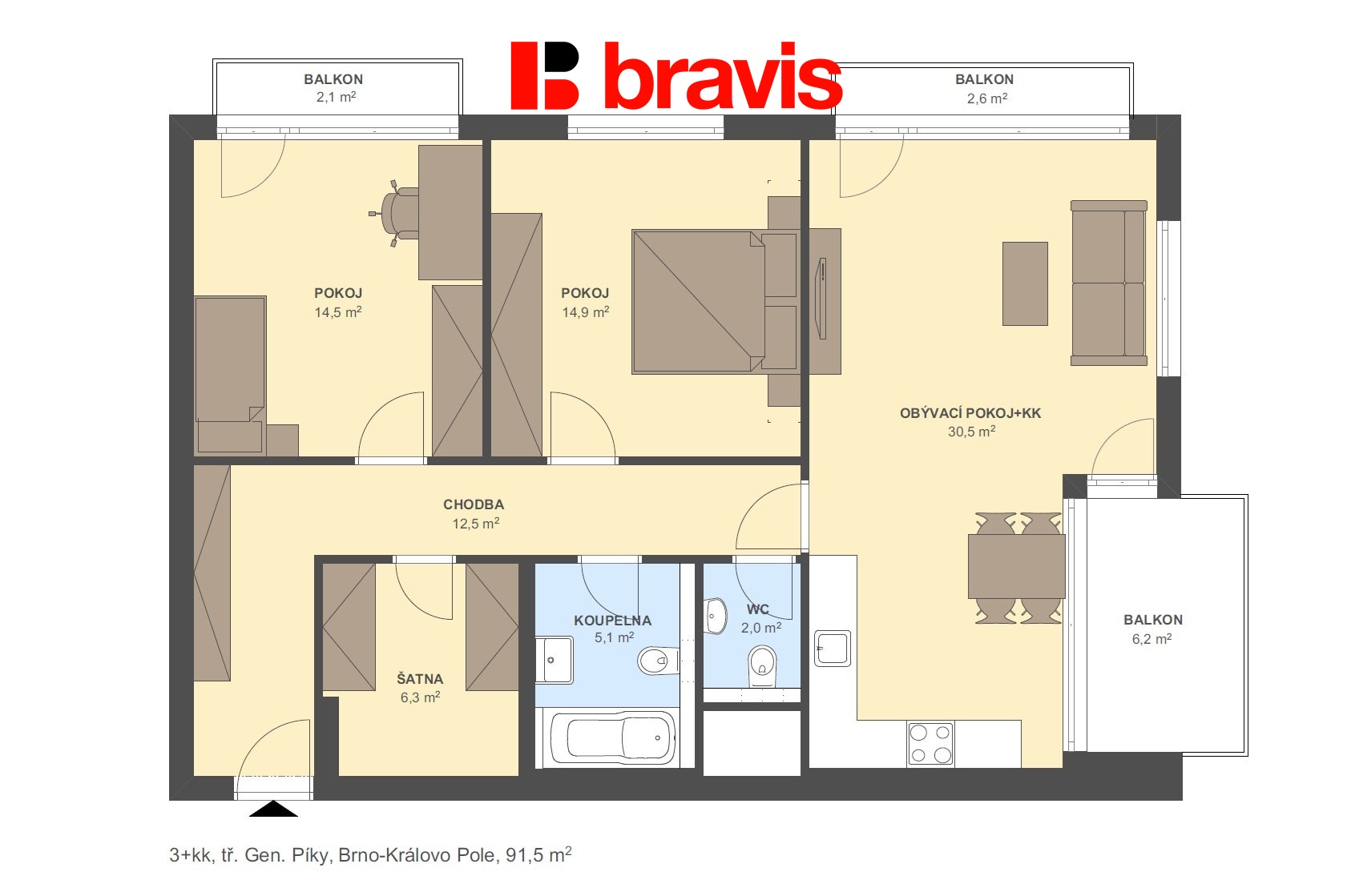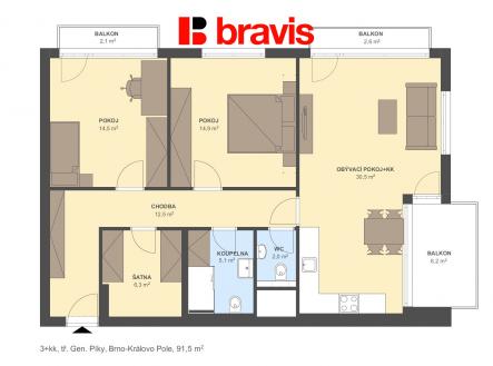 Výhradně nabízíme k pronájmu moderní a prostorný byt dispozice 3+kk o celkové ploše bytu 86 m² se dvěma balkóny (2,1 a 2,6m² ) a lodžií (6,2m² ) v novostavbě domu v žádané lokalitě Brno – Černá Pole, třída Generála Píky. Byt se nachází v 6. NP novostavby se dvěma výtahy. K bytu náleží sklep a dvě garážová stání za poplatek. Velkou výhodou je možnost stát se prvním nájemníkem. Kuchyně je vybavena linkou se spotřebiči - varná deska, horkovzdušná trouba, lednice, mrazící box, myčka a jídelní stůl se židlemi. V obývací části pokoje je sedací souprava, konferenční stolek a TV stěna. Z tohoto pokoje je vstup na větší lodžii a jeden z balkonů. Díky své pozici jsou zde krásné výhledy do okolní zeleně a na celé město Brno, zejména pak na jeho dominanty Brna jako je hrad Špilberk a katedrálu Petrov. Jedna z ložnic je plně vybavena, druhá ložnice je bez vybavení se vstupem na balkon. V koupelně je sprchový kout, umyvadlo a toaleta. Druhá toaleta je pak samostatně. Šatna v bytě je vybavena úložným systémem a pračkou se sušičkou. V předsíni i v hlavní ložnici jsou vestavěné skříně. V celém bytě jsou již instalovány klimatizační jednotky (ve všem obytných místnostech) a venkovní žaluzie. Vytápění bytu je zajištěno podlahovým topením. Byt je částečně zařízený a připravený k okamžitému nastěhování. Lokalita je velmi klidná, obklopená zelení, s výbornou dostupností do centra města. V bezprostředním okolí se nachází Botanická zahrada, stejně jako kompletní občanská vybavenost – obchody, školy, MHD i služby. Byt je ideální volbou pro zájemce, kteří hledají kvalitní bydlení v atraktivní a klidné části Brna. Prohlídky jsou možné kdykoliv po domluvě s uvedeným makléřem. Možnost zajištění jednorázového nebo pravidelného úklidu naší úklidovou firmou.